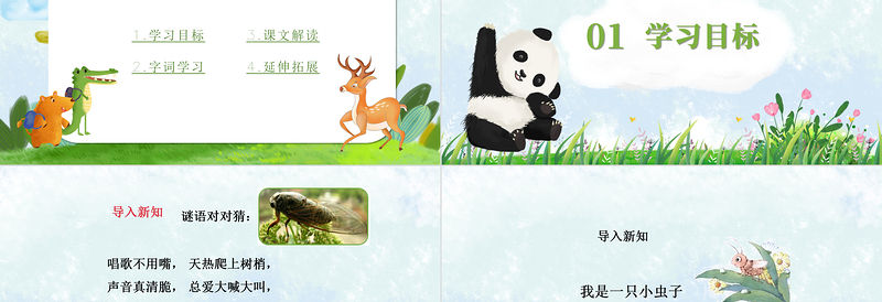 導入新知唱歌不用嘴,聲音真清脆,嘴尖像根錐,專吸樹枝水。謎語對對猜:謎底:( ) 天熱爬上樹梢,總愛大喊大叫,明明啥也不懂,偏說知道知道。蟬、知了