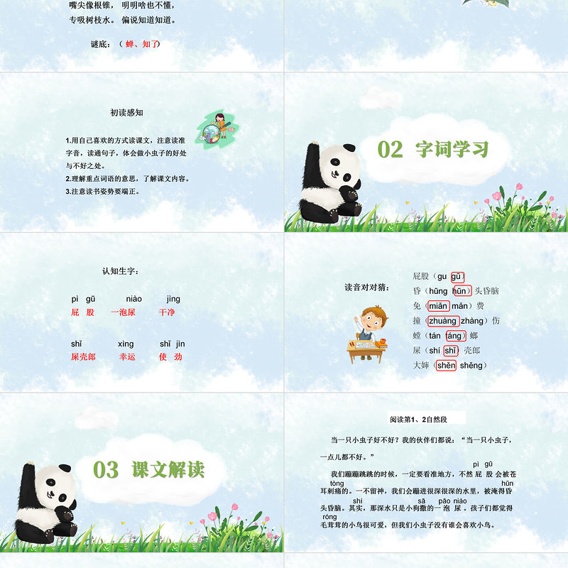 初讀感知1.用自己喜歡的方式讀課文,注意讀準字音,讀通句子,體會做小蟲子的好處與不好之處。 2.理解重點詞語的意思,了解課文內容。3.注意讀書姿勢要端正。