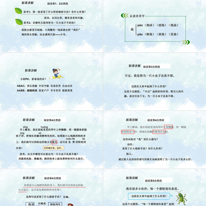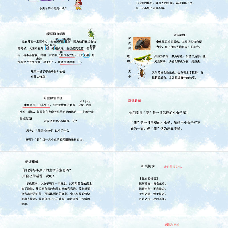 新課講解 早晨醒來,小蟲子喝了一口露水,然后用晶瑩的露水洗了洗臉,然后把自己的觸須也擦的亮亮的,等到想要出去旅行的時候,可以跳到狗的身上,坐上免費的特快列出去旅行。等到自己開心的時候,就放開嗓子快活的唱歌。你們覺得小蟲子的生活有意思嗎?用自己的話說一說吧!