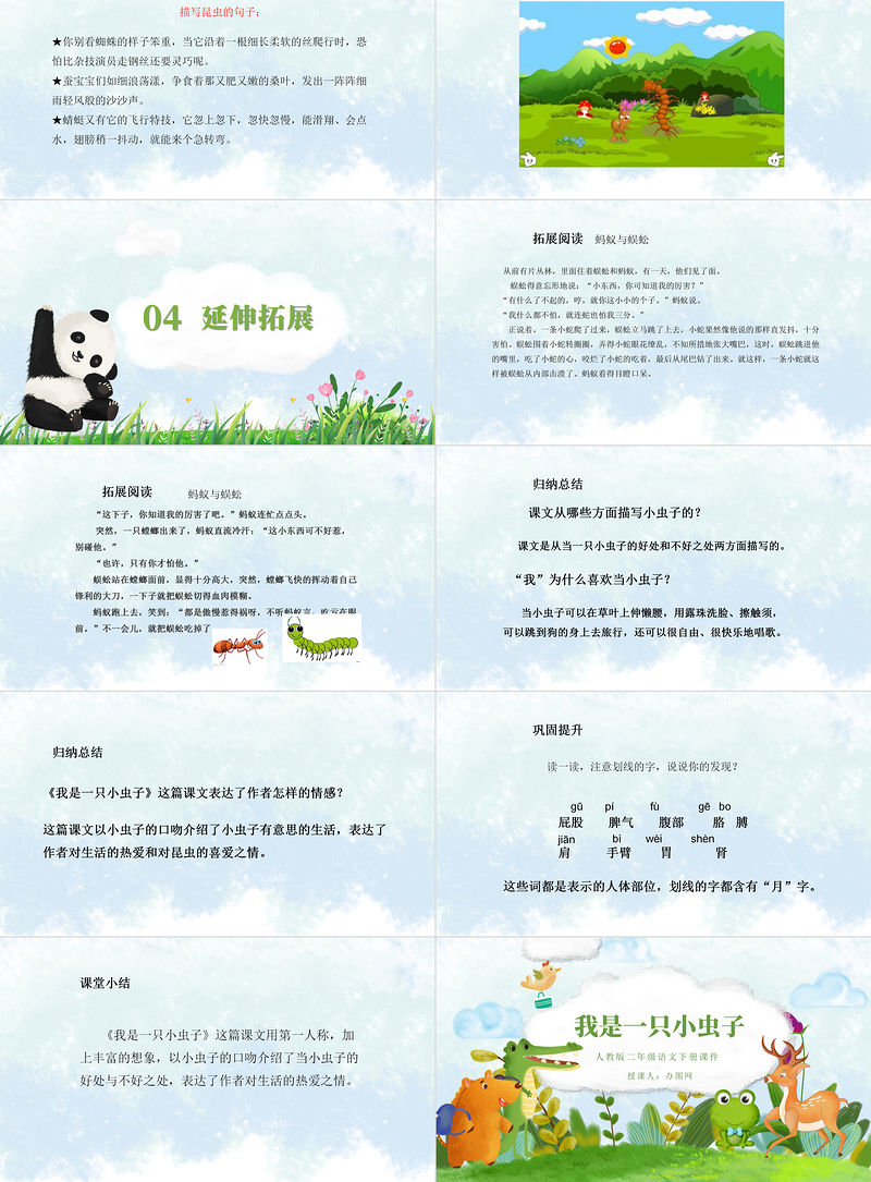 課堂小結 《我是一只小蟲子》這篇課文用第一人稱,加上豐富的想象,以小蟲子的口吻介紹了當小蟲子的好處與不好之處,表達了作者對生活的熱愛之情。