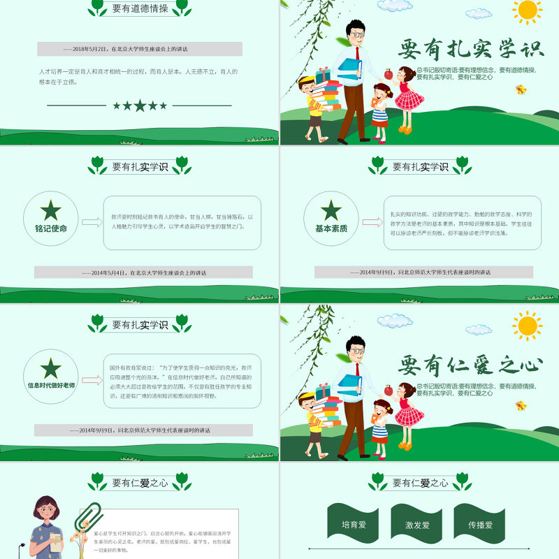 好老師要用愛培育愛、激發(fā)愛、傳播愛,通過真情、真心、真誠拉近同學(xué)生的距離,滋潤學(xué)生的心田,使自己成為學(xué)生的好朋友和貼心人?!?2014年9月9日,同北京師范大學(xué)師生代表座談時的講話