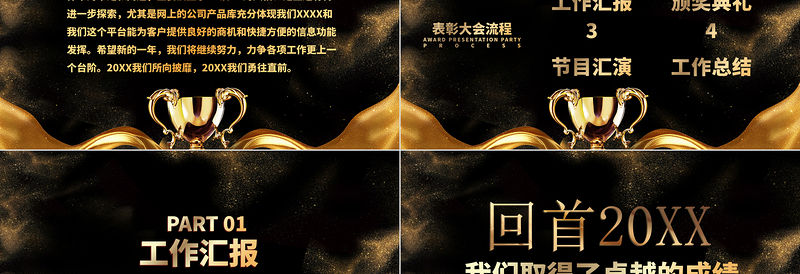 工作匯報1頒獎典禮2節目匯演3工作總結4表彰大會流程AWARD PRESENTATION PARTY PROCESS