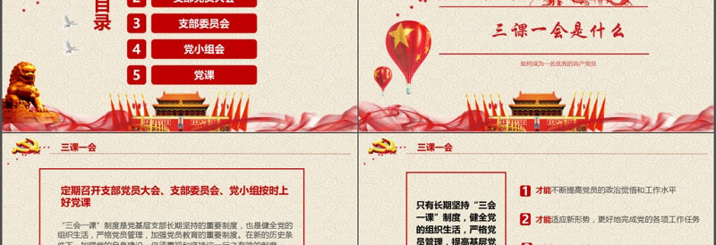 三課一會[ 三課一會黨建學習PPT]三會一課”的作用在參加河北省委常委班子民主生活會時,把嚴格黨內生活作為“四個重要法寶”之一提出,明確要求增強黨內生活的政治性、原則性、戰斗性,使各種方式的黨內生活都有實質性內容,都能有針對性地解決問題,堅決反對黨內生活中的自由主義、好人主義。作為黨內生活的重要組成部分,“三會一課”制度,對于加強黨的建設發揮著重要作用。