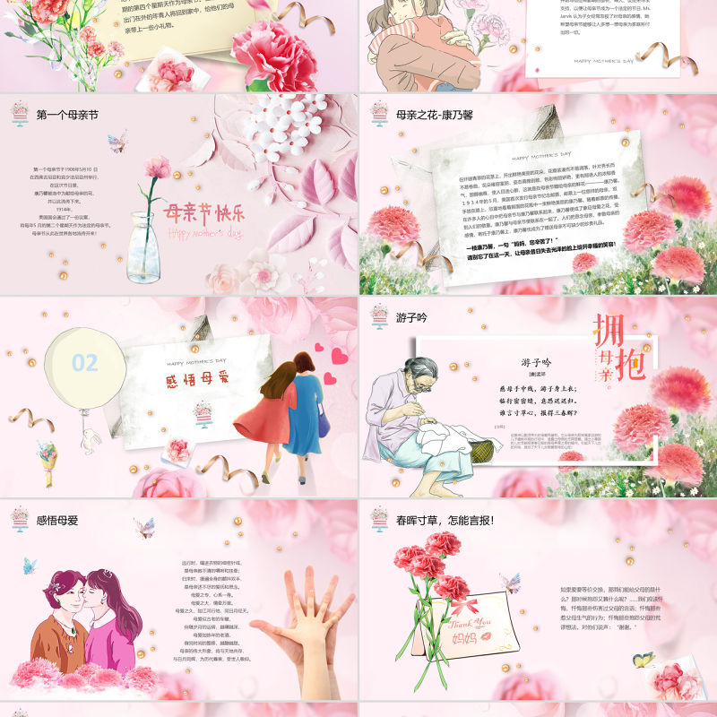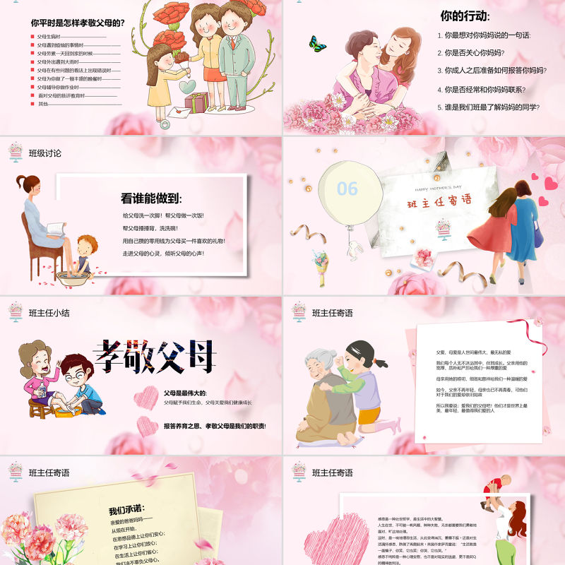 <p>HAPPY MOTHER’S DAY辦圖網(wǎng)學校 主講老師:辦老師 班級:六一班</p><br><p>母親節(jié)的由來感悟母愛感恩父母可憐天下父母心班級討論班主任寄語HAPPY MOTHER’S DAY</p><br><p>母親節(jié)的由來HAPPY MOTHER’S DAY</p><br><p>古代母親節(jié)起源于希臘,古希臘人在這一天向希臘神話中的眾神之母赫拉致敬。在17世紀中葉,母親節(jié)流傳到英國,英國人把封齋期的第四個星期天作為母親節(jié)。在這一天里,出門在外的年青人將回到家中,給他們的母親帶上一些小禮物。古代母親節(jié)HAPPY MOTHER’S DAY</p><br><p>現(xiàn)代意義上的母親節(jié)現(xiàn)代意義上的母親節(jié)起源于美國,由Ms. Jarvis(1864-1948)發(fā)起,她終身未婚,一直陪伴在她母親身邊,她母親于1905年去世, Ms. Jarvis悲痛欲絕,兩年后Ms. Jarvis 和她的朋友開始寫信給有影響的部長、商人、議員來尋求支持,以便讓母親節(jié)成為一個法定的節(jié)日. Ms. Jarvis 認為子女經(jīng)常忽視了對母親的感情,她希望母親節(jié)能夠讓人多想一想母親為家庭所付出的一切。HAPPY MOTHER’S DAY</p><br><p>第一個母親節(jié)于1908年5月10 日在西弗吉尼亞和賓夕法尼亞州舉行,在這次節(jié)日里,康乃馨被選中為獻給母親的花,并以此流傳下來。1914年,美國國會通過了一份議案,將每年5 月的第二個星期天作為法定的母親節(jié)。母親節(jié)從此在世界各地流傳開來!第一個母親節(jié)</p><br><p>母親之花-康乃馨在纖細青翠的花莖上,開出鮮艷美麗的花朵,花瓣緊湊而不易凋落,葉片秀長而不易卷曲,花朵雍容富麗,姿態(tài)高雅別致,色彩絢麗嬌艷,更有那誘人的濃郁香氣,甜醇幽雅,使人目迷心醉,這就是在母親節(jié)贈給母親的鮮花————康乃馨。 1934年的5月,美國首次發(fā)行母親節(jié)紀念郵票,郵票上一位慈祥的母親,雙手放在膝上,欣喜地看著前面的花瓶中一束鮮艷美麗的康乃馨。隨著郵票的傳播,在許多人的心目中把母親節(jié)與康乃馨聯(lián)系起來,康乃馨便成了象征母愛之花,受到人們的敬重。康乃馨與母親節(jié)便聯(lián)系在一起了。人們把思念母親、孝敬母親的感情,寄托于康乃馨上,康乃馨也成為了贈送母親不可缺少的珍貴禮品。一枝康乃馨,一句“媽媽,您辛苦了!”請別忘了在這一天,讓母親昔日失去光澤的臉上綻開幸福的笑容!HAPPY MOTHER’S DAY</p><br><p>感悟母愛HAPPY MOTHER’S DAY</p><br><p>游子吟慈母手中線,游子身上衣;臨行密密縫,意恐遲遲歸。誰言寸草心,報得三春暉?游子吟[唐]孟郊</p><br><p>感悟母愛遠行時,縫進衣物的細密針線,是母親數(shù)不清的囑咐和掛牽;歸來時,摸遍全身的顫抖雙手,是母親述不盡的愛撫和思念。母愛之專,心系一身。母愛之大,情牽萬里。母愛之久,如江河行地,同日月經(jīng)天。母愛似古老的車轍,伴隨歲月的運轉(zhuǎn),越碾越深,母愛如陳年的老酒,偕同時間的推移,越釀越甜。母親的偉大形象,將與天地共存,與日月同輝,為歷代尊祟,受世人敬仰。</p><br><p>春暉寸草,怎能言報!如果愛要等價交換,那我們能給父母的是什么?那時候抱怨又算什么呢?……我們應該懺悔,懺悔那些傷害過父母的言語;懺悔那些惹父母生氣的行為;懺悔那些抱怨父母的荒謬想法。對他們說聲:“謝謝。”</p><br><p>感悟母愛小時候曾嫌母親愛嘮叨, 小時候曾嫌母親的手粗糙, 小時候曾嫌母親的拘束太多, 小時候曾嫌母親總愛說我是孩童…… 做母親后方知母親的艱辛, 做母親后方懂母親的心思, 做母親后方曉母愛不求回報, 做母親后方領(lǐng)略到為人母的諸多感受。 母愛是甘甜的乳汁, 母愛是小心翼翼的嘮叨, 母愛是電話另一端的叮嚀, 母愛是心靈受創(chuàng)時的撫慰, 母愛是春風得意時的忠告…… 歲月的滄桑銘刻在母親的臉上, 兩鬢白霜告誡母親早已不再年輕, 成長的足跡里閃爍著母愛的倩影, 粗糙的雙手是真實的寫照和見證。</p><br><p>感恩父母HAPPY MOTHER’S DAY</p><br><p>母親頌母親就象一部長電影一直放到 她生命的最后時刻 就在這部電影里我們看到了母親的樸實 憨厚 勤勞和智慧 母親用她甘甜的乳汁哺育了我們喂養(yǎng)了我們這是我們終身的幸福和驕傲因為我們有一位平凡而又偉大的母親 當我們一遍又一遍地重播著母親這部電影時淚流滿面的我們 已完全與母親融為了一體 母親就象是一部長電影 永遠珍藏在我們敬仰的心底</p><br><p>他 們──給父母沒有他們,便沒有我們。是他們,哺育了我們。是他們,拓開了道路。沒有他們,我們的世界是殘缺的。沒有他們,我們的生活是跛腳的。他們的存在,使我們的世界完整。他們的存在,使我們的生命鮮活。有了他們,我們才可以超越歷史。有了他們,我們才可以贏獲明天。因此,我愛他們,我們愛他們。他們給我們的我們也可以一樣給他們:一片藍天白云 一輪明月朝陽一雙眼睛 一座家園一顆赤子之心 </p><br><p>感恩父母襁褓時,母親的甘甜乳汁,是滋潤肌膚的甘露,孩提時,母親的苦澀汗水,是澆灌心田的清泉。求學時,母親的耐心誘導,是啟動靈感的馬達,困惑時,母親的殷切教誨,是撥正航向的羅盤。失足時,母親的善意規(guī)勸,是迷途識返的路標,成功時,母親的熱情鼓勵,是乘勝前進的風帆。攻關(guān)時,母親的積極鞭策,是攀登要隘的階梯,拼搏時,母親的大力支持,是沖越激流的航船。挫折時,母親的親切關(guān)懷,是闖出困境的號角,患病時,母親的精心護理,是戰(zhàn)勝苦痛的靈丹