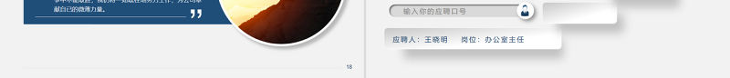 應(yīng)聘人:王曉明 崗位:辦公室主任感謝您的支持嚴(yán)謹(jǐn)實(shí)用框架完整動(dòng)態(tài)競(jìng)聘PPT模板輸入你的應(yīng)聘口號(hào)POST COMPETITION REPORT.