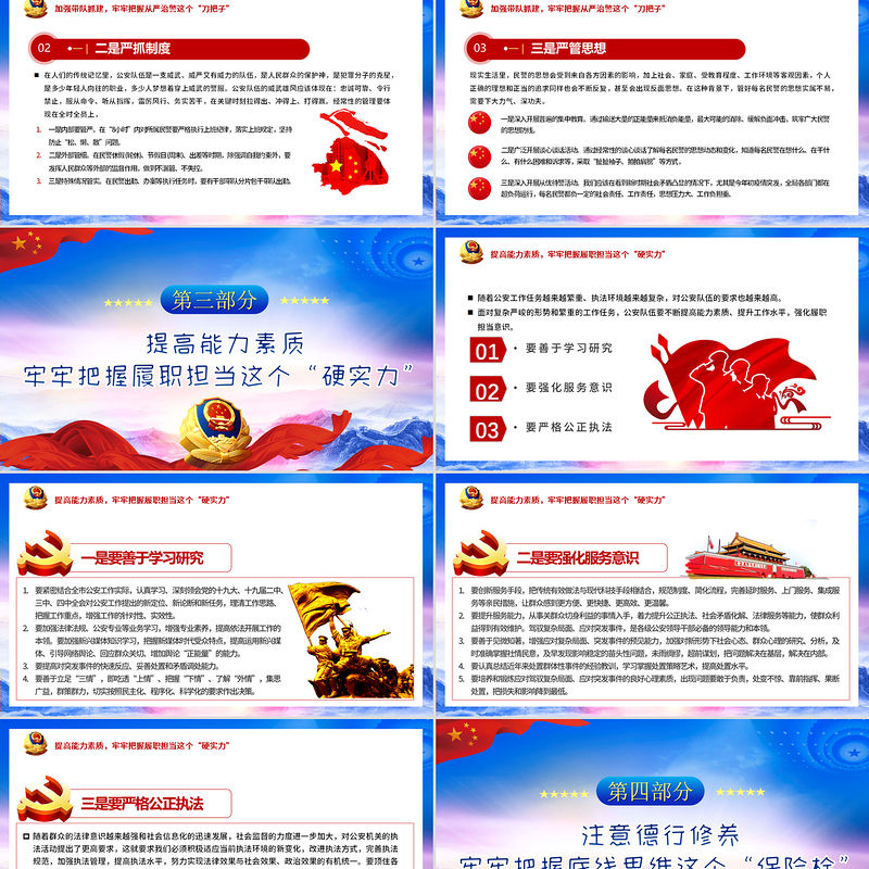 提高能力素質(zhì),牢牢把握履職擔(dān)當(dāng)這個(gè)“硬實(shí)力”隨著公安工作任務(wù)越來越繁重、執(zhí)法環(huán)境越來越復(fù)雜,對(duì)公安隊(duì)伍的要求也越來越高。面對(duì)復(fù)雜嚴(yán)峻的形勢(shì)和繁重的工作任務(wù),公安隊(duì)伍要不斷提高能力素質(zhì)、提升工作水平,強(qiáng)化履職擔(dān)當(dāng)意識(shí)。要善于學(xué)習(xí)研究要強(qiáng)化服務(wù)意識(shí)要嚴(yán)格公正執(zhí)法010203