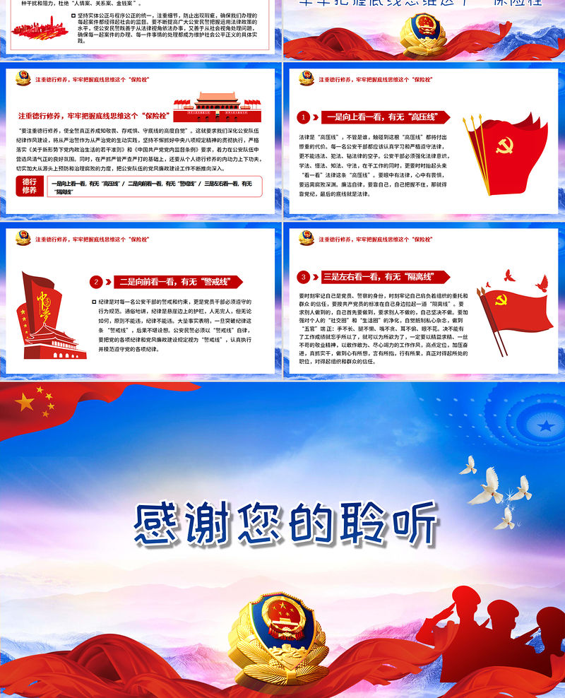 注重德行修養(yǎng),牢牢把握底線思維這個(gè)“保險(xiǎn)栓”紀(jì)律是對(duì)每一名公安干部的警戒和約束,更是黨員干部必須遵守的行為規(guī)范。通俗地講,紀(jì)律是懸崖邊上的護(hù)欄,人無完人,但無論如何,原則不能違,紀(jì)律不能違。大量事實(shí)表明,一旦突破紀(jì)律這條 “警戒線”,后果不堪設(shè)想。公安民警必須以“警戒線”自律,要把黨的各項(xiàng)紀(jì)律和黨風(fēng)廉政建設(shè)規(guī)定視為“警戒線”,認(rèn)真執(zhí)行并模范遵守黨的各項(xiàng)紀(jì)律。二是向前看一看,有無“警戒線”2