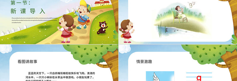 藍(lán)藍(lán)的天空下,一只白鴿嘴銜橄欖枝快樂(lè)地飛翔。清清的河水中,一只只小蝌蚪在水草叢中做游戲。小朋友玩累了,坐在公園的椅子上喝水……看圖講故事