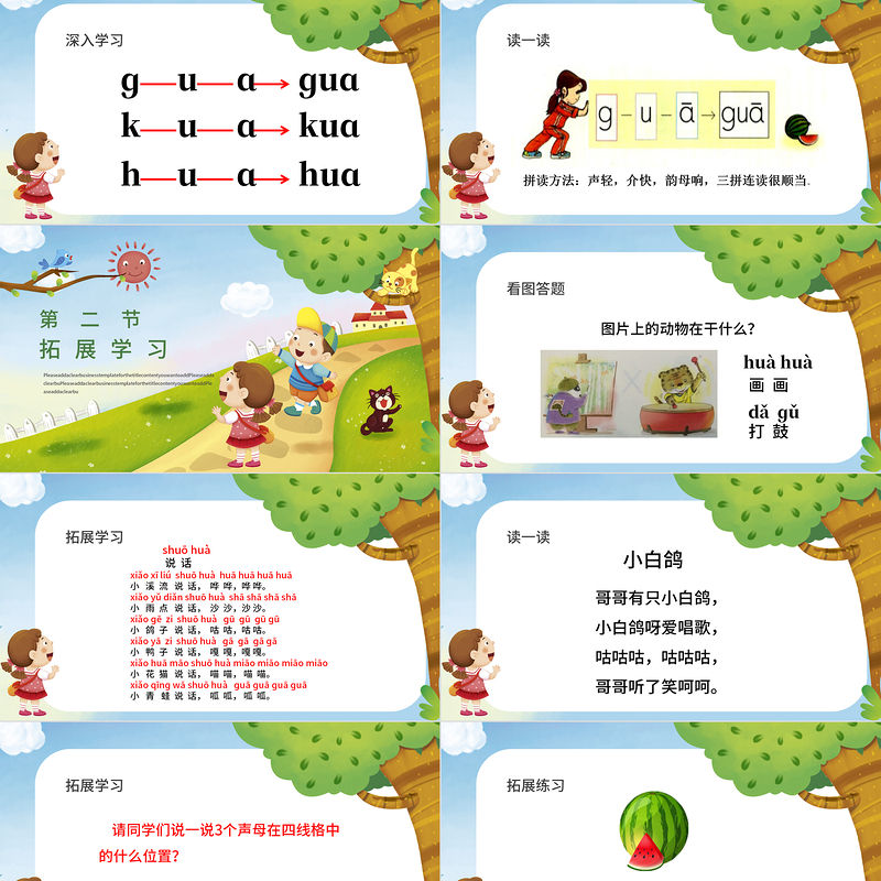 拓展學(xué)習(xí) shuō huà ? 說(shuō) 話xiǎo xī liú shuō huà huā huā huā huā 小 溪 流 說(shuō) 話, 嘩 嘩,嘩 嘩。xiǎo yǔ diǎn shuō huà shā shā shā shā 小 雨 點(diǎn) 說(shuō) 話, 沙 沙,沙 沙。xiǎo ɡē zi shuō huà ɡū ɡū ɡū ɡū小 鴿 子 說(shuō) 話, 咕 咕,咕 咕。xiǎo yā zi shuō huà ɡā ɡā ɡā ɡā 小 鴨 子 說(shuō) 話, 嘎 嘎,嘎 嘎。xiǎo huā māo shuō huà miāo miāo miāo miāo小 花 貓 說(shuō) 話, 喵 喵, 喵 喵。xiǎo qīnɡ wā shuō huà ɡuā ɡuā ɡuā ɡuā小 青 蛙 說(shuō) 話, 呱 呱, 呱 呱。