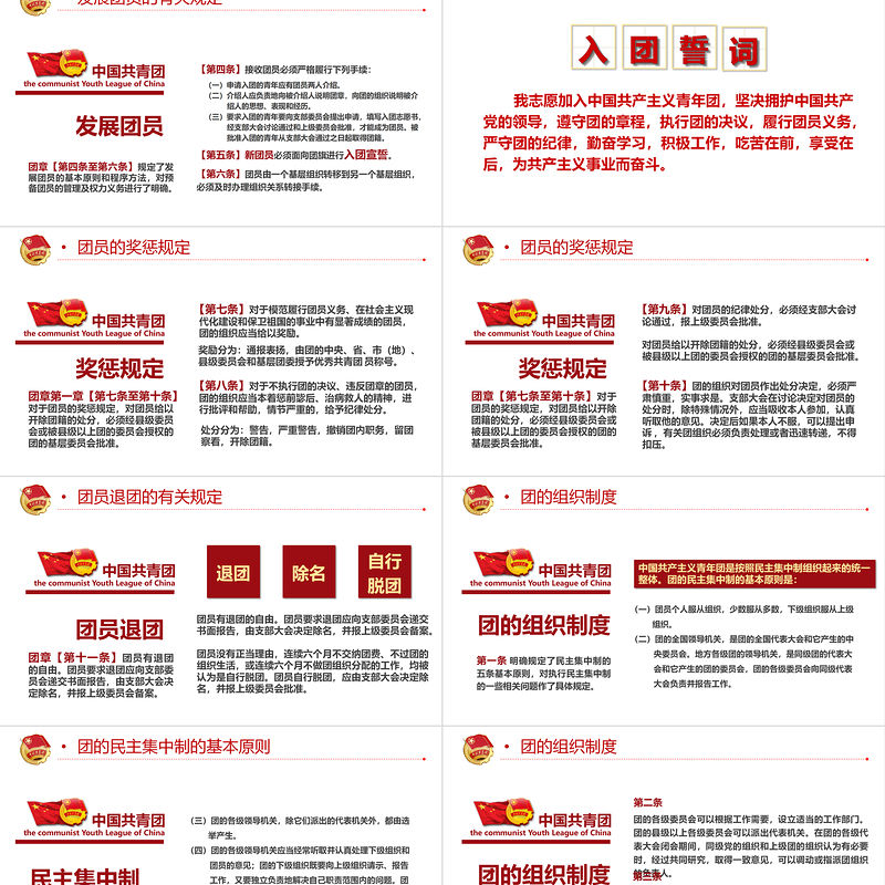 【第七章】規(guī)定了團(tuán)徽、團(tuán)旗的樣式,強(qiáng)調(diào)團(tuán)的各級(jí)組織和每一個(gè)團(tuán)員都要維護(hù)團(tuán)徽?qǐng)F(tuán)旗的尊嚴(yán)。【第一條】團(tuán)旗中國(guó)共產(chǎn)主義青年團(tuán)團(tuán)旗旗面為紅色,象征革命勝利;左上角綴黃色五角星,周圍環(huán)繞黃色圓圈,象征中國(guó)青年一代緊密團(tuán)結(jié)在中國(guó)共產(chǎn)黨周圍。團(tuán)的重要會(huì)議以及團(tuán)日活動(dòng)可以使用團(tuán)旗。【第二條】團(tuán)徽?qǐng)F(tuán)徽?qǐng)F(tuán)旗中國(guó)共產(chǎn)主義青年團(tuán)團(tuán)徽的內(nèi)容為團(tuán)旗,齒輪,麥穗,初升的太陽(yáng)及其光芒,寫有“中國(guó)共青團(tuán)”五字的綬帶。它象征著共青團(tuán)在馬克思列寧主義、毛澤東思想的光輝照耀下,團(tuán)結(jié)各族青年,朝著黨所指引的方向奮勇前進(jìn)。團(tuán)的組織和團(tuán)員應(yīng)按規(guī)定使用團(tuán)徽。團(tuán)旗 團(tuán)徽 團(tuán)歌 團(tuán)員證