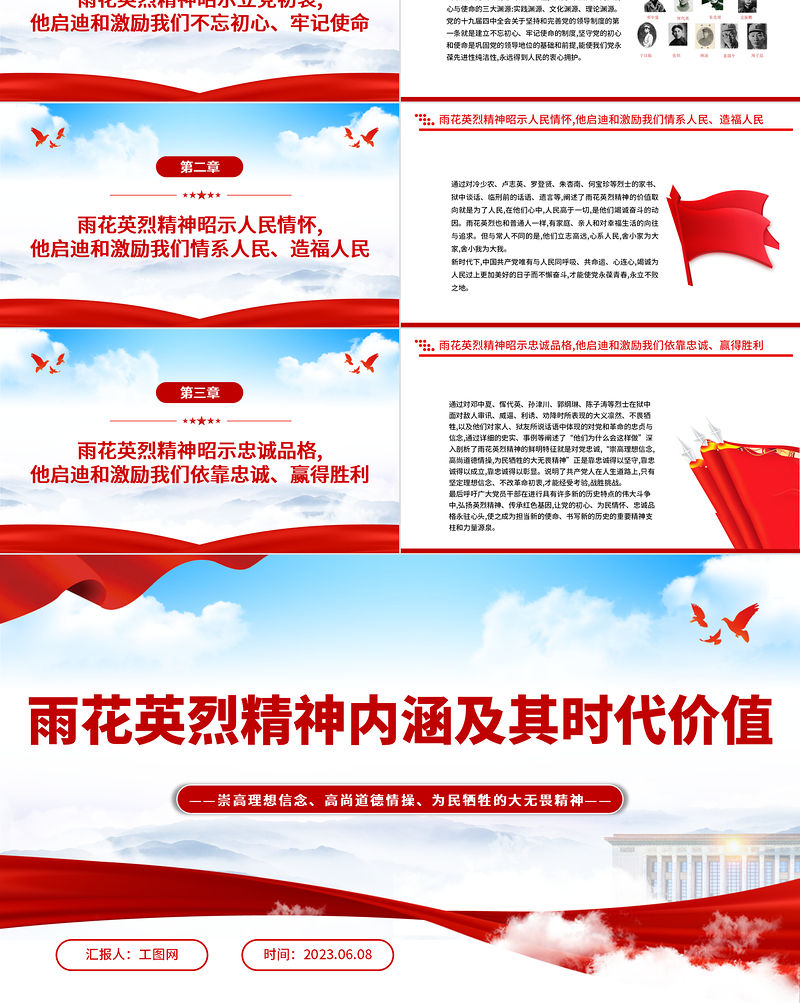 雨花英烈精神內涵及其時代價值匯報人:工圖網時間:2023.06.08——崇高理想信念、高尚道德情操、為民犧牲的大無畏精神——