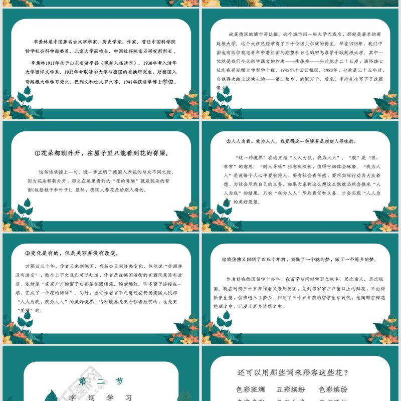 這是德國的城市哥廷根。這個城市因一座大學而成名,那就是著名的哥廷根大學。這個大學已經孕育了三十位諾貝爾獎的得主。早在1935年,我們中國也有兩位有志青年帶著祖國的期望和自己的宏志求學于歌廷根大學。其中一位就是我們今天所學課文的作者──季羨林──當時他才二十五歲,滿懷雄心壯志在哥廷根大學留學十載,1945年才回歸祖國。1980年,也就是三十五年后,當他再次踏上這塊土地──第二故鄉,感慨萬千。后來,季老先生寫下了這篇課文。