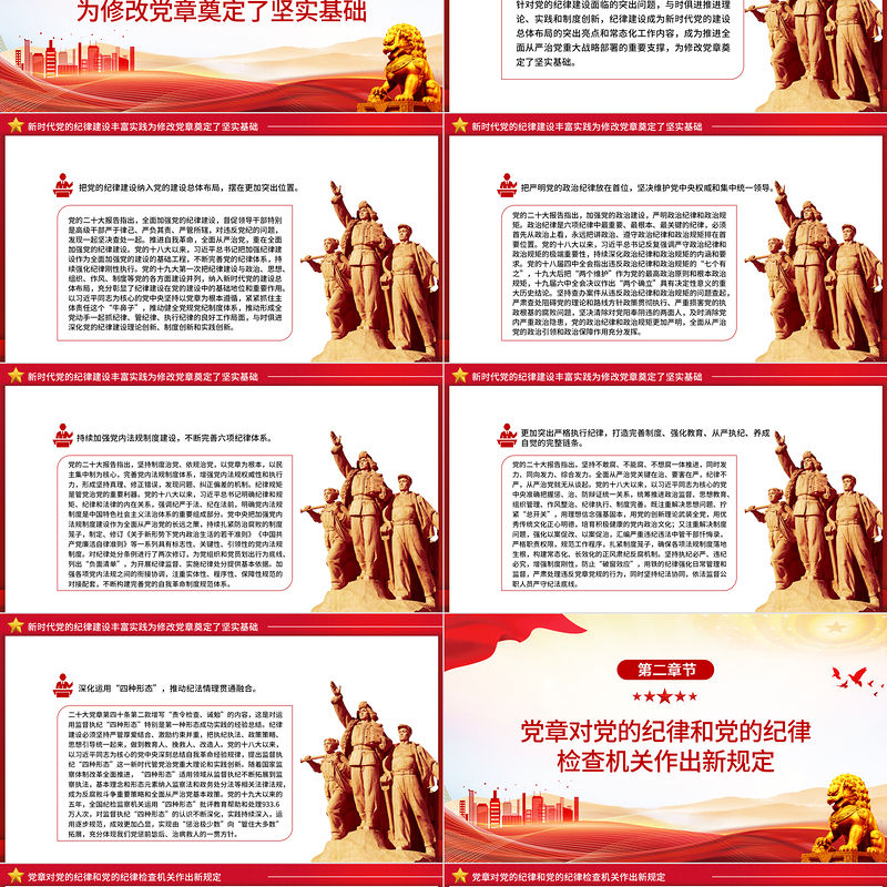 前言導讀黨章是黨的總章程,是黨的根本大法,集中體現了黨的理論和路線方針政策,規定了黨的重要制度,對推進黨的事業、加強黨的建設具有重要指導作用。從一大黨綱體現對紀律問題的高度重視,到二大以后多次對黨章紀律有關內容進行重要修改,黨章的發展歷程體現了黨的百年自我革命偉大歷程,展現了黨勇于自我革命的鮮明品格。黨的二十大通過的《中國共產黨章程(修正案)》,充實黨的紀律、黨的紀律檢查機關部分的相關內容,為堅決貫徹堅定不移全面從嚴治黨戰略部署,深入推進新時代新征程紀檢監察工作高質量發展提供了根本遵循。