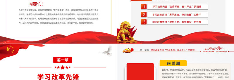 CONCLUDING REMARKS共產(chǎn)黨員使命光榮、責任重大。今天,因為時間的關(guān)系,只和大家分享了6個改革先鋒的故事,會后大家可以通過強國APP去學習這100位改革先鋒的先進事跡,非??筛杩善奈枞诵?,時刻激勵著我們堅定不移聽黨話、跟黨走,將改革開放進行到底。這次培訓(xùn)對大家來說,是一次難得的機會,希望大家珍惜機會,沉下心來,專心學習,以良好的學風和作風圓滿完成培訓(xùn)任務(wù),真正在思想上有新提高、理論上有新收獲、工作上有新突破,不斷開創(chuàng)我縣農(nóng)村工作的新局面。
