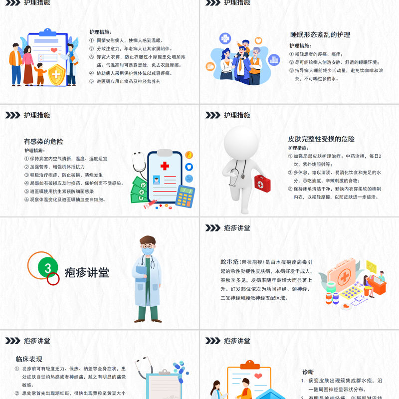 疼痛:與疾病引起的神經痛有關睡眠形態紊亂:與皮膚破損,疼痛有關??有感染的危險:與免疫力下降有關皮膚完整性受損的危險:與疾病引起的皮膚破潰及長期臥床有關護理原則