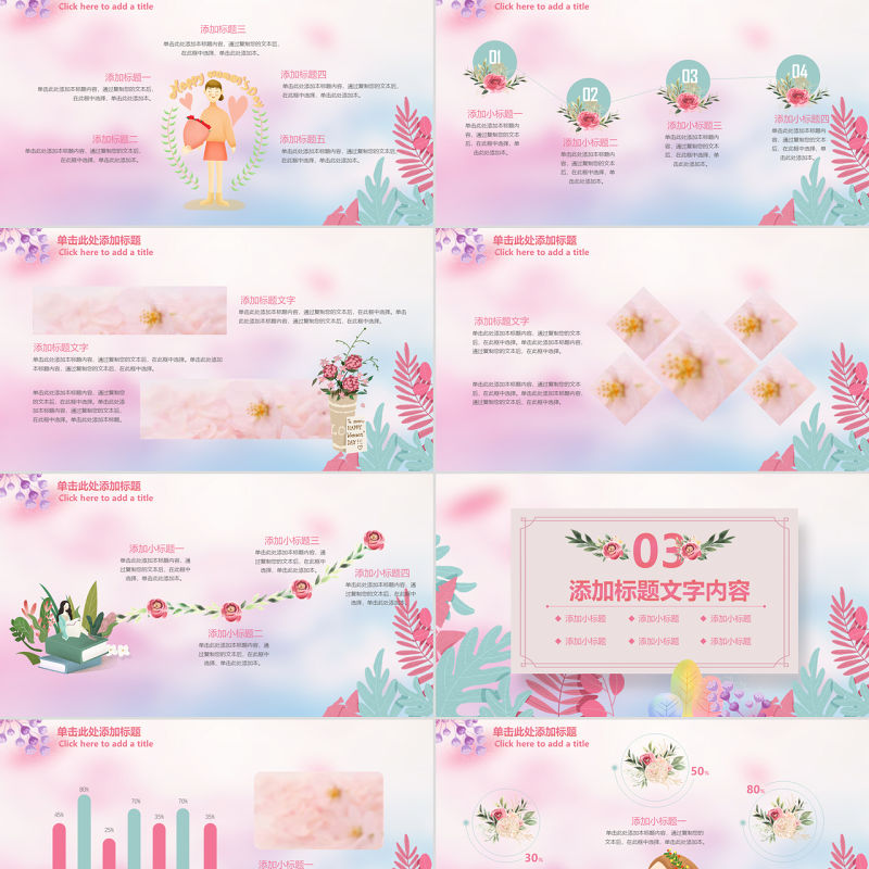 原創粉色溫馨美麗女人婦女節工作總結PPT模板-版權可商用