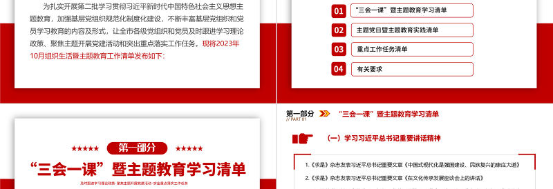 目錄CONTENTS010203“三會一課”暨主題教育學習清單主題黨日暨主題教育實踐清單重點工作任務清單04有關要求