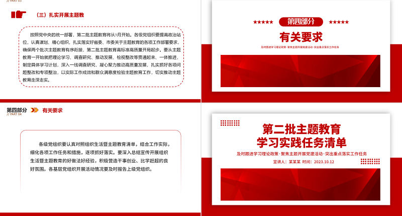 黨員教育培訓專題黨課——喜迎二十大 永遠跟黨走 奮進新征程——第二批主題教育 學習實踐任務清單及時跟進學習理論政策·聚焦主題開展黨建活動·突出重點落實工作任務宣講人:工圖網 時間:2023.10.12