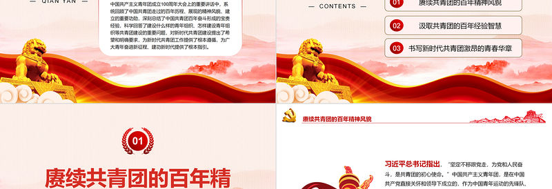<p>—慶祝中國共產主義青年團成立100周年大會專題課件賡續百年精神風貌書寫新時代青春樂章</p><br><p></p><br><p></p><br><p>賡續共青團的百年精神風貌航向</p><br><p>習近平總書記指出,“堅定不移跟黨走,為黨和人民奮斗,是共青團的初心使命?!敝袊伯a主義青年團,是在中國共產黨直接關懷和領導下成立的,作為中國青年運動的先鋒隊、黨的忠實助手和可靠后備軍,共青團從成立之日起就以黨的旗幟為旗幟、以黨的意志為意志、以黨的使命為使命,在不同時期踐行初心使命的拼搏奮斗中,展現出了極為可貴的精神風貌。賡續共青團的百年精神風貌</p><br><p>是共青團在新民主主義革命時期展現出的精神風貌,這一時期共青團廣泛傳播馬克思主義,用先進思想啟迪青年,塑造了廣大團員青年對黨忠貞不渝、勇于沖鋒陷陣的可貴品質。是共青團在社會主義革命和建設時期展現出的精神風貌,這一時期共青團積極參與中華民族有史以來最為廣泛而深刻的社會變革,用“敢教日月換新天”的豪情激發青年,塑造了廣大團員青年主動作為、勇挑重擔的可貴品質。賡續共青團的百年精神風貌</p><br><p>是共青團在改革開放和社會主義現代化建設新時期展現出的精神風貌,這一時期共青團適應黨和國家工作中心戰略轉移,用“團結起來、振興中華”的時代強音號召青年,塑造了廣大團員青年勇立潮頭、銳意進取的可貴品質。是共青團在中國特色社會主義進入新時代展現出的精神風貌,這一時期共青團積極投身偉大斗爭、偉大工程、偉大事業、偉大夢想波瀾壯闊的實踐,用“清澈的愛,只為中國”的內心最強音砥礪青年,塑造了廣大團員青年守正創新、踔厲奮發的可貴品質。賡續共青團的百年精神風貌</p><br><p>中國共產主義青年團在百年歷史洪流中展現出的精神風貌,已成為共青團最深厚凝重的底色,也成為共青團與黨同心同向、建立功勛最重要的深層文化基因,是新時代共青團接續前行、建功立業必須賡續的內在精神血脈。賡續共青團的百年精神風貌</p><br><p>汲取共青團的百年經驗智慧</p><br><p>善于總結歷史經驗,汲取歷史智慧是我們黨的一個好傳統,深刻體現了歷史和理論發展的辯證關系。偉大的實踐必然積累寶貴的經驗,產生偉大的理論,偉大的理論也必然指導偉大的實踐,推動偉大的實踐。及時總結歷史經驗本身就是我們黨不斷創造偉大成就的重要經驗。習近平總書記深刻總結了一百年來,共青團堅定理想、矢志不渝形成的寶貴經驗,并指出,“這是共青團面向未來、再立新功的重要遵循?!奔橙」睬鄨F的百年經驗智慧</p><br><p>把堅持黨的領導作為共青團的立身之本習近平總書記指出,“沒有中國共產黨,就沒有中國共青團?!鄙羁探沂玖酥袊睬鄨F與中國共產黨的本質統一性,以及共青團把黨的領導作為立身之本的理論根源,揭示了共青團能夠團結帶領青年,推動中國青年運動沿著正確政治方向前行的奧秘所在。把堅守理想信念作為共青團的政治之魂習近平總書記指出,共產主義社會的遠大理想是“共青團最根本、最持久的凝聚力”。理想信念是一個人、一個組織和一個國家的精神之魂,有了崇高的理想信念,也就有了最根本的魂,魂在則形聚。共青團百年來正是把堅守黨的崇高理想信念作為政治之魂,才鍛造了自身最牢固的團結和最強大的力量。汲取共青團的百年經驗智慧</p><br><p>把投身民族復興作為共青團的奮進之力實現中華民族偉大復興,是近代以來中華民族最偉大的夢想,是激勵中華兒女團結奮進、開辟未來的精神旗幟。民族復興是百年來黨團結帶領全國各族人民奮發前行的根本力量,也是在牢牢扭住民族復興的歷史主題中,中國共產主義青年團才團結起了一切可以團結的青春力量,唱響了壯麗的青春之歌。把扎根廣大青年作為共青團的活力之源習近平總書記指出,“共青團歷經百年滄桑而青春煥發,依靠的就是始終扎根廣大青年”。青年朝氣蓬勃、思維活躍,更樂于跟革新者走、更樂于走革新者的路,更愿意投身到忘我斗爭中去,更能在忘我斗爭中激發活力。共青團作為青年的先進組織,活力在廣大青年,活力之源在扎根廣大青年,要在從廣大青年這片沃土中汲取養分、獲取力量。汲取共青團的百年經驗智慧</p><br><p>書寫新時代共青團激昂的青春華章</p><br><p>習近平總書記指出,“時代總是把歷史責任賦予青年。新時代的中國青年,生逢其時、重任在肩,施展才干的舞臺無比廣闊,實現夢想的前景無比光明。”“在新的征程上,如何更好把青年團結起來、組織起來、動員起來,為實現第二個百年奮斗目標、實現中華民族偉大復興的中國夢而奮斗,是新時代中國青年運動和青年工作必須回答的重大課題?!被仡櫄v史、總結經驗,汲取智慧、指引未來,習近平總書記在講話中為書寫新時代共青團激昂的青春華章指明了方向。書寫新時代共青團激昂的青春華章</p><br><p>堅持為黨育人,把共青團建設成引領中國青年思想進步的政治學校書寫新時代共青團激昂的青春華章</p><br><p>自覺擔當盡責,把共青團鍛造成組織中國青年永久奮斗的先鋒力量書寫新時代共青團激昂的青春華章</p><br><p>心系廣大青年,把共青團打造成黨聯系青年最為牢固的橋梁紐帶書寫新時代共青團激昂的青春華章</p><br><p>勇于自我革命,把共青團培育成緊跟黨走在時代前列的先進組織書寫新時代共青團激昂的青春華章