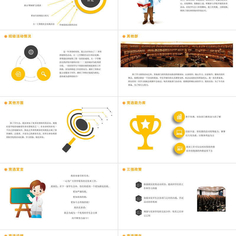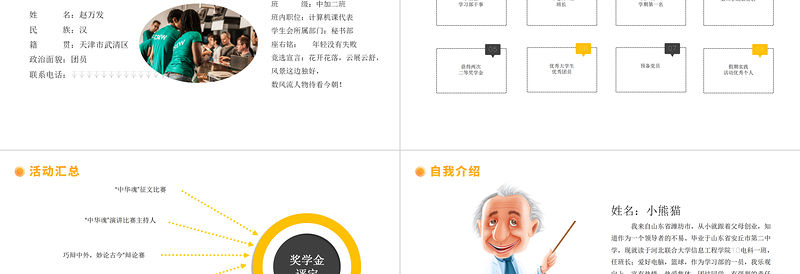 <p>學生會精選創意簡約學生會競選business report主講人:xxxClick here to enter your text, change the color or size of the text. You can also format the appropriate text and adjust the line spacing of the text. </p><br><p>姓 名:趙萬發民 族:漢籍 貫:天津市武清區政治面貌:團員聯系電話:xxxxxxxxxxxxx班 級:中加二班班內職位:計算機課代表學生會所屬部門:秘書部座右銘: 年輕沒有失敗競選宣言:花開花落,云展云舒,風景這邊獨好,數風流人物待看今朝!個人介紹</p><br><p>獲獎經歷</p><br><p>“中華魂”征文比賽“中華魂”演講比賽主持人巧辯中外,妙論古今“辯論賽職業生涯規劃主持人大一上寒假社會實踐活動幸福花園志愿者活動唐山“博瑞智”志愿者活動匯總</p><br><p>姓名:小熊貓 我來自山東省濰坊市,從小就跟著父母創業,知道作為一個領導者的不易。畢業于山東省安丘市第二中學,現就讀于河北聯合大學信息工程學院10電科一班,任班長;愛好電腦,籃球,作為學習部的一員,我樂觀向上、富有熱情、熱愛集體、團結同學、有強烈的責任心。在校期間,我勤奮上進,積極參與學校開展的各項活動。在院學生會工作的期間,我工作積極,大膽創新,得到了部長和其他同學的認可。 自我介紹</p><br><p> 這一年多的時間里,我主辦并協辦了20多項班級特色活動。大一上學期的生活小常識競賽,帶領我們班取得了第一名的好成績,大一下學期的五四評優中我所在的B532宿舍被評為優秀團小組。一名好的學生干部最首要的就是要有工作熱情。因為熱情是工作的原動力。擁有了熱情才能主動服務于同學。擁有了熱情才能成為朋友,進而成為老師的助手! 班級活動情況</p><br><p> 除了學習部的活動之外,其他部門組織的活動我也積極參加,認真組織,細心學習,注意細節。像每次組織舞會,我都會留意一下活動的策劃,學長學姐們的人員調度安排。機會總是眷戀有準備的人,我一直在準備著,所以任何一次學習的機會我都不會放過,每次其他部門辦活動,我都是積極認真的學習。我的宗旨:為了今天而準備,為了明天兒努力。其他部</p><br><p> 除了學生會,我也參加了很多社團組織的活動,我現在是學校的電腦愛好者社團成員之一,在業余時間補充一下自己的電腦知識。除此之外利用課余時間我也去做了很多兼職、志愿者,豐富自己的課余生活,經常去參加觀看其他學院的活動比賽,學習經驗,取長補短。其他方面</p><br><p>競選能力庫</p><br><p>我將本著盡職盡責,一心為廣大同學服務的宗旨來工作。我相信,在下一屆學生會中,你們將看到一個更加踏實的我,更加嚴謹的我,更加高效的我,更加斗志昂揚的我!我在此承諾:我會為成為一個優秀的學生會主席而不斷努力奮斗!競選宣言</p><br><p>做強我院優勢活動項目,提高同學們的工作和學習熱情加強本院學生會各部門之間的溝通,嘗試活動協作機制增強與兄弟學院的交流合作,取其之長補己之短01三強政策</p><br><p>競選設想</p><br><p>競選理念</p><br><p>清風拂面定流芬芳我自談笑道且也長尋覓已過幾許期盼處處陽光云展花落前輩去風景這邊亦好縱觀信息長河盡數風流人物待看今朝</p><br><p>希望與大家同建設信息工程學院學生會共創信息工程學院美好明天</p><br><p>學生會精選創意簡約學生會競選business report主講人:xxxClick here to enter your text, change the color or size of the text. You can also format the appropriate text and adjust the line spacing of the text. </p><br>