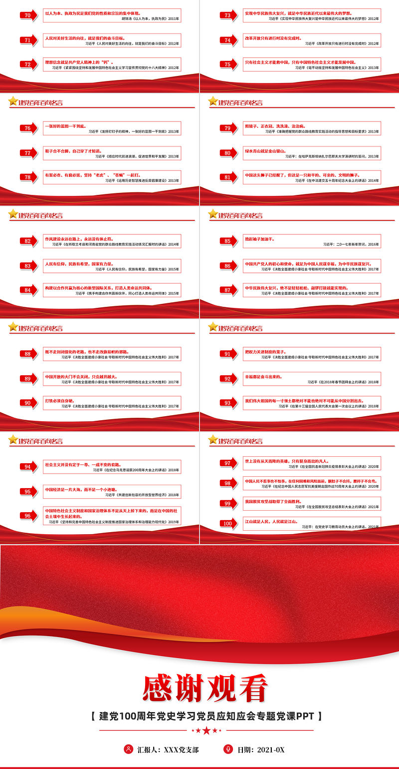 黨史百年百句名言【 建黨100周年黨史學(xué)習(xí)黨員應(yīng)知應(yīng)會專題黨課PPT 】日期:2021-0X匯報(bào)人:XXX黨支部