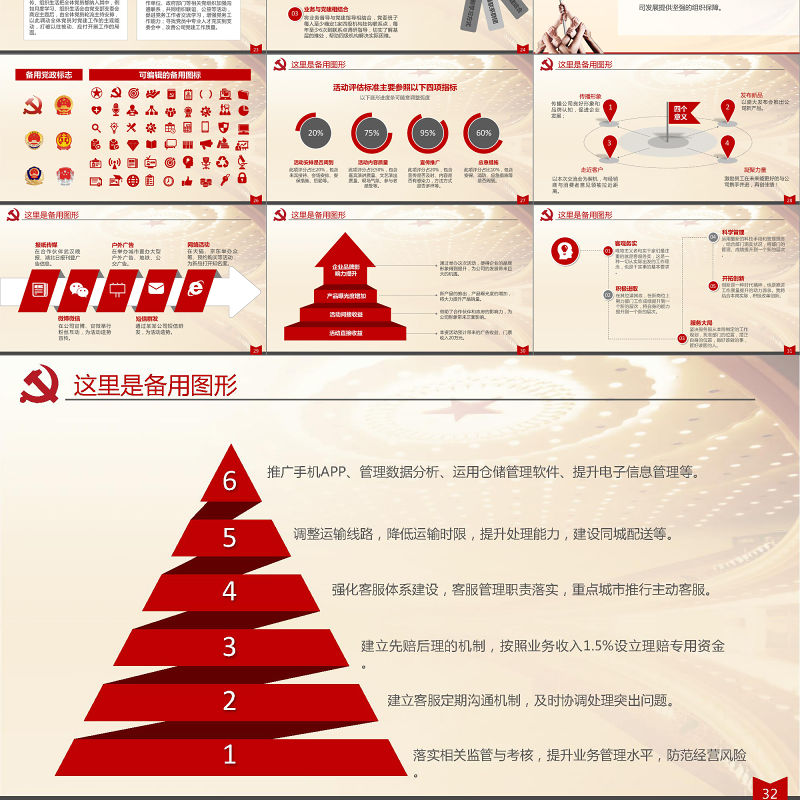 推廣手機APP、管理數據分析、運用倉儲管理軟件、提升電子信息管理等。調整運輸線路,降低運輸時限,提升處理能力,建設同城配送等。強化客服體系建設,客服管理職責落實,重點城市推行主動客服。建立先賠后理的機制,按照業務收入1.5%設立理賠專用資金。建立客服定期溝通機制,及時協調處理突出問題。落實相關監管與考核,提升業務管理水平,防范經營風險。123456這里是備用圖形