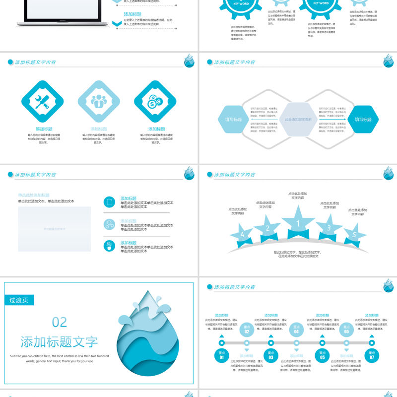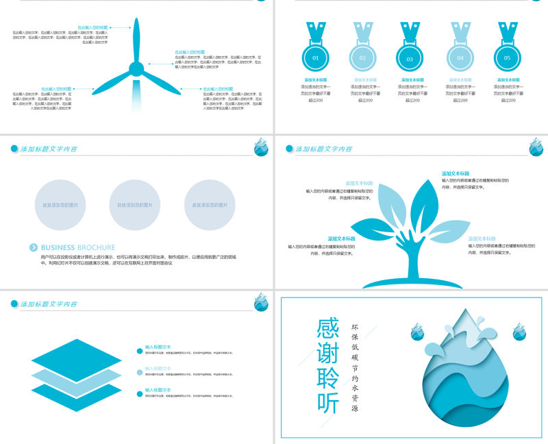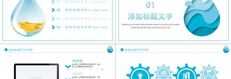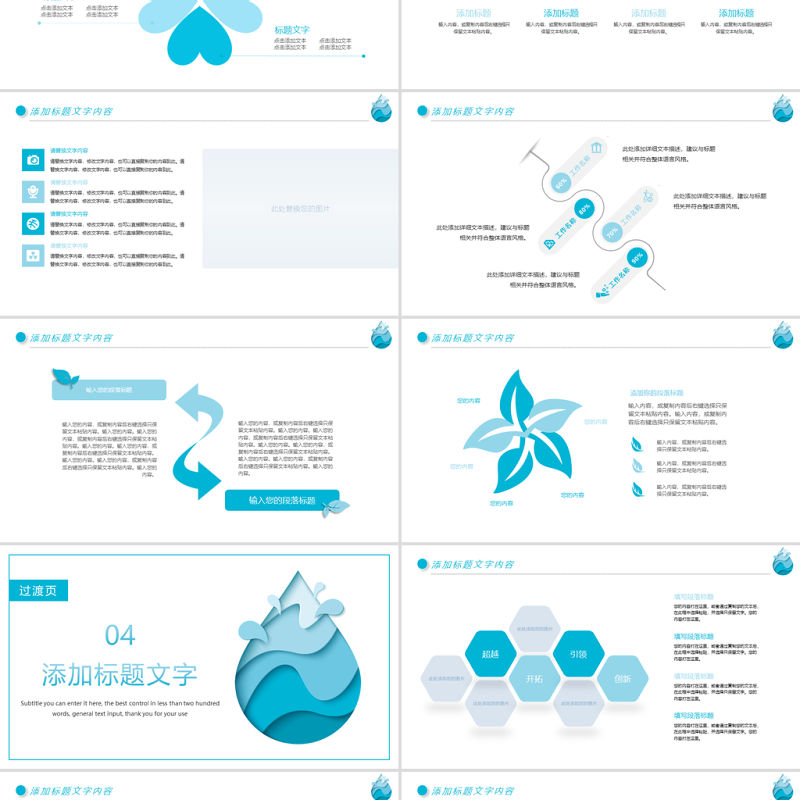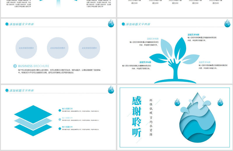 原創唯美扁平化節約用水環保低碳節約水資源PPT模板-版權可商用