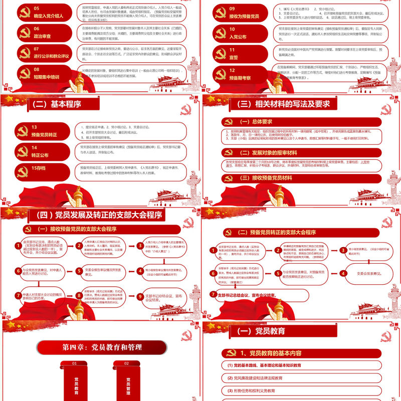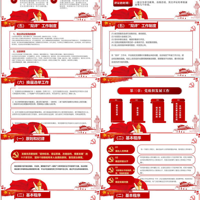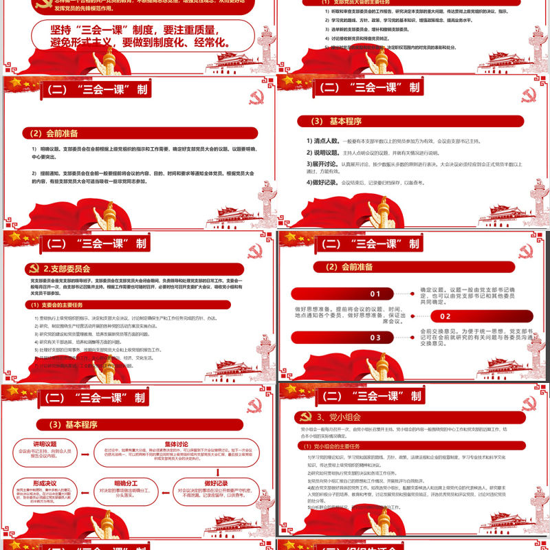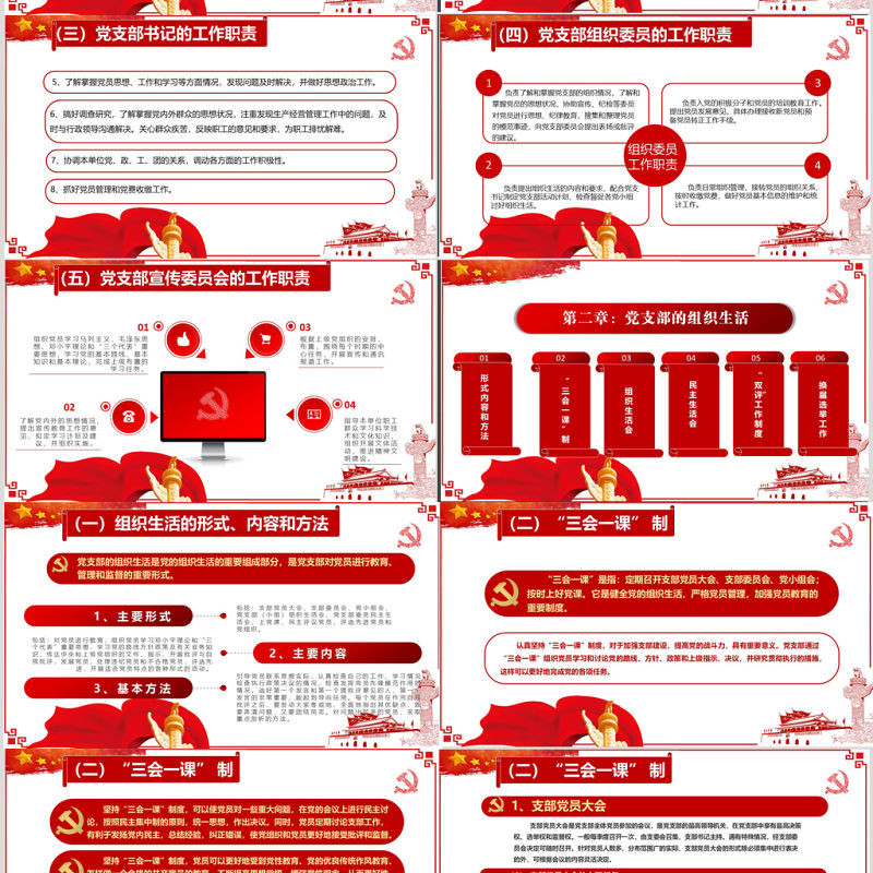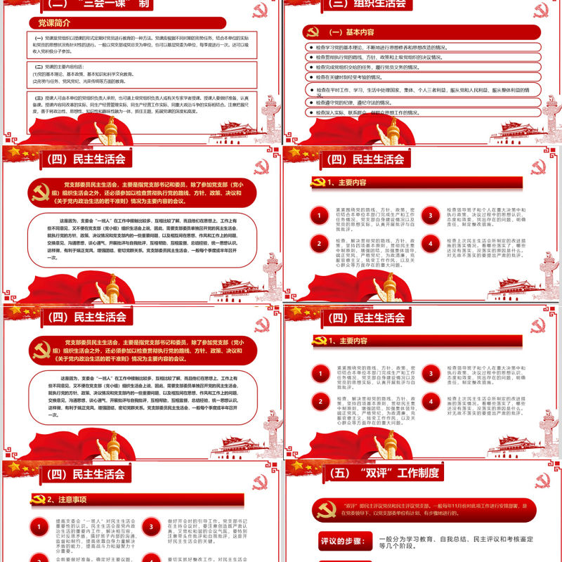 1、主要形式2、主要內(nèi)容3、基本方法包括:支部黨員大會、支部委員會、黨小組會、黨支部(小組)組織生活會、黨支部委員民主生活會、上黨課、民主評議黨員、評選先進黨員和黨組織。包括:對黨員進行教育,組織黨員學習**理論和“三個代表”重要思想,學習黨的路線方針政策及有關(guān)業(yè)務知識,傳達中央和上級黨組織的文件、指示,開展批評與自我批評,發(fā)展黨員,處理違紀黨員和不合格黨員,評選先進,開展適合黨員特點的各種形式的活動。引導黨員聯(lián)系思想實際,認真檢查自己的工作、學習情況,檢查執(zhí)行政策決議的情況,檢查發(fā)揮黨員先鋒模范作用的情況。選好第一個發(fā)言和第一個提批評意見的人,第一個發(fā)言的非常重要,能起到導向任用。每個黨員在作完自我批評之后,要發(fā)動大家客觀地、全面地指出其優(yōu)缺點,既要弄清問題,又要團結(jié)同志。對問題比較多的黨員,采取重點剖析的方法。
