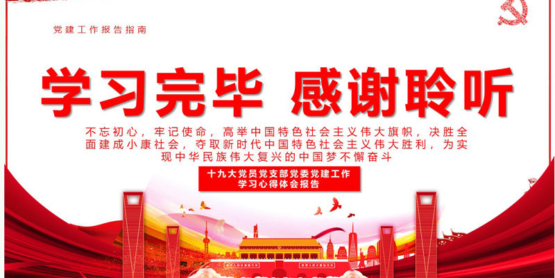 十九大黨員黨支部黨委黨建工作學習心得體會報告不忘初心,牢記使命,高舉中國特色社會主義偉大旗幟,決勝全面建成小康社會,奪取新時代中國特色社會主義偉大勝利,為實現(xiàn)中華民族偉大復興的中國夢不懈奮斗黨建工作報告指南學習完畢 感謝聆聽
