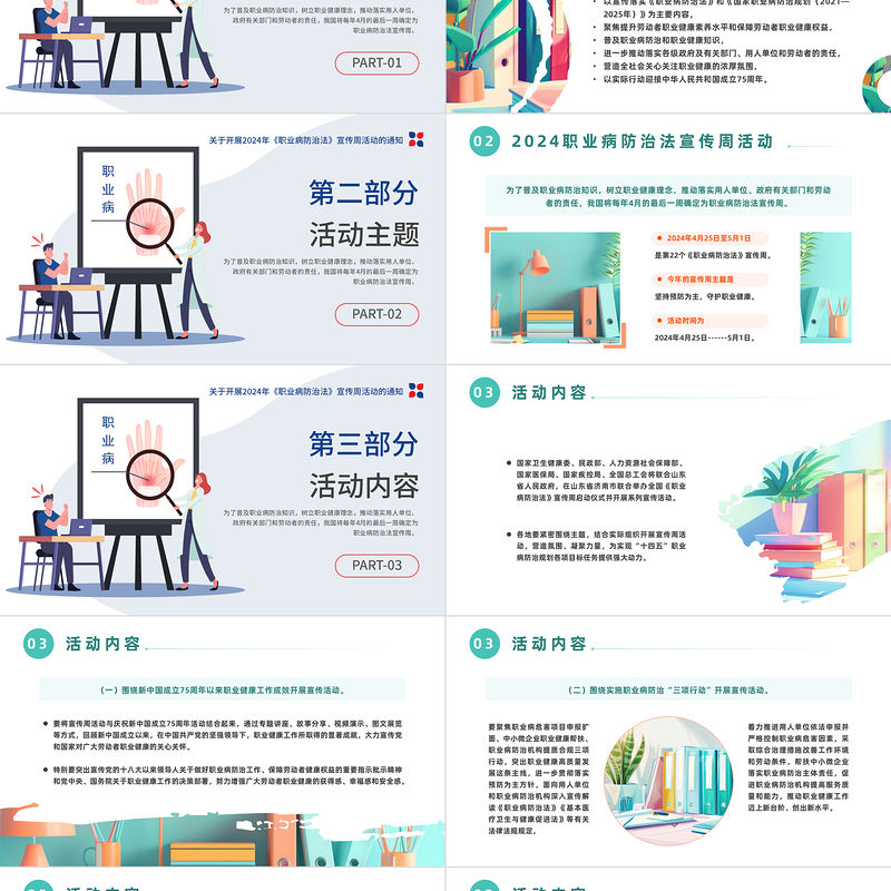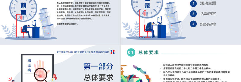 第一部分總體要求為了普及職業(yè)病防治知識,樹立職業(yè)健康理念,推動落實用人單位、政府有關(guān)部門和勞動者的責(zé)任,我國將每年4月的最后一周確定為職業(yè)病防治法宣傳周。PART-01關(guān)于開展2024年《職業(yè)病防治法》宣傳周活動的通知