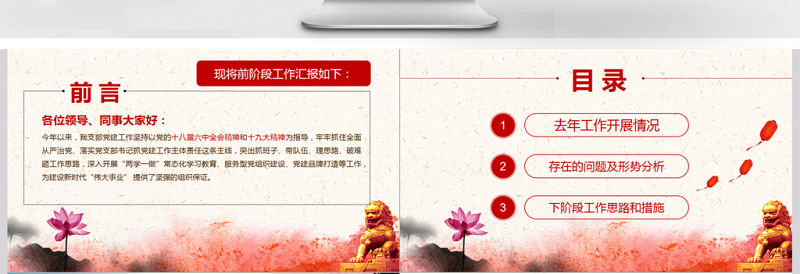 前 言各位領導、同事大家好:今年以來,我支部黨建工作堅持以黨的十八屆六中全會精神和十九大精神為指導,牢牢抓住全面從嚴治黨、落實黨支部書記抓黨建工作主體責任這條主線,突出抓班子、帶隊伍、理思路、破難題工作思路,深入開展“兩學一做”常態化學習教育、服務型黨組織建設、黨建品牌打造等工作,為建設新時代“偉大事業” 提供了堅強的組織保證。現將前階段工作匯報如下: