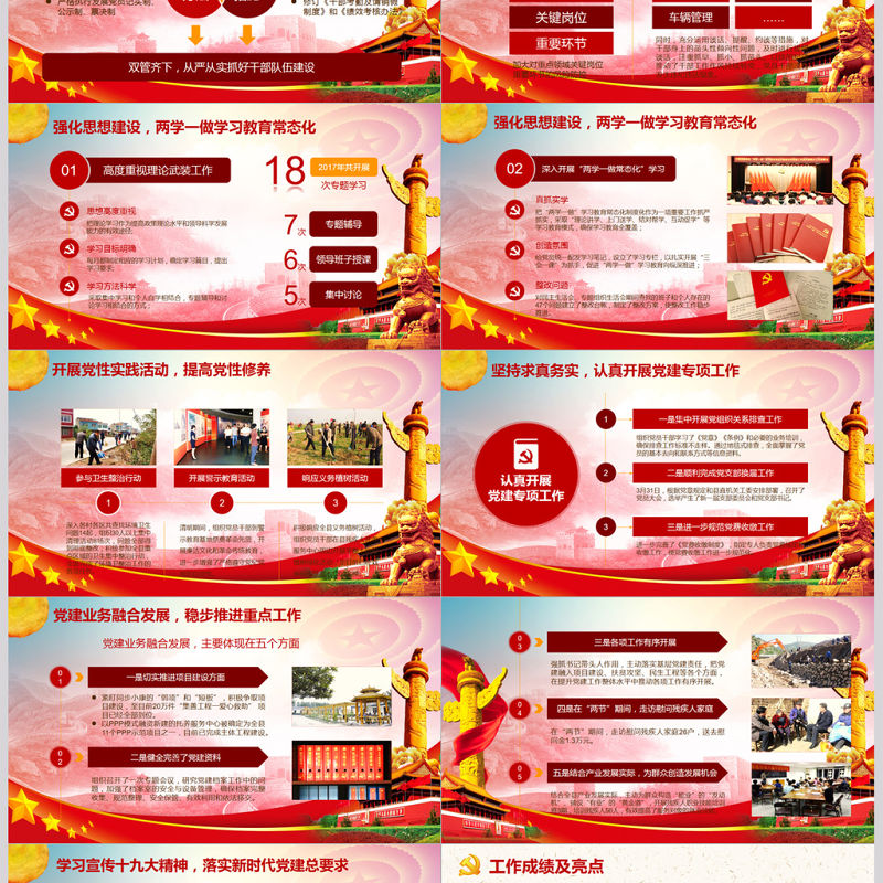 重點工作回顧去年我支部主要從五個方面發力,推動黨建工作的開展:12345全面從嚴管黨治黨,落實黨建工作責任堅持求真務實,認真開展黨建專項工作開展黨性實踐活動,提高黨性修養黨建業務融合發展,穩步推進重點工作強化思想建設,兩學一做學習教育常態化學習宣傳十九大精神,落實新時代黨建總要求6延時符(正式講課時請刪除)