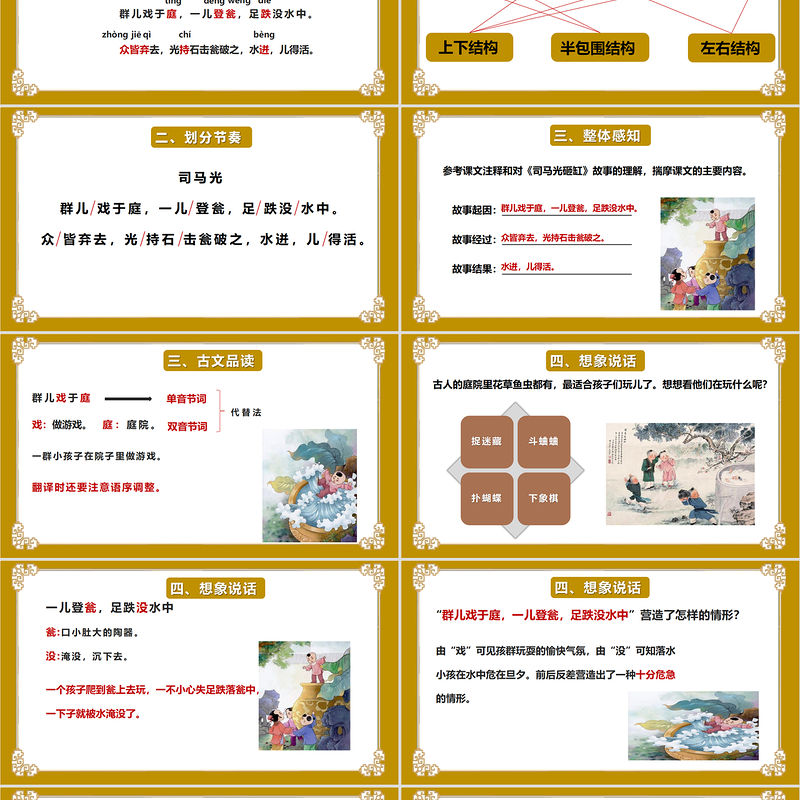 一兒登甕,足跌沒水中一個孩子爬到甕上去玩,一不小心失足跌落甕中,一下子就被水淹沒了。甕:口小肚大的陶器。沒:淹沒,沉下去。四、想象說話