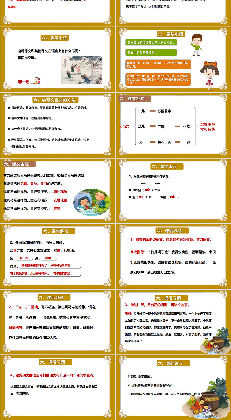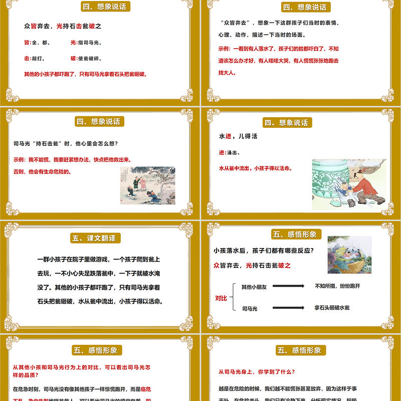 五、課文翻譯一群小孩子在院子里做游戲,一個孩子爬到甕上去玩,一不小心失足跌落甕中,一下子就被水淹沒了。其他的小孩子都嚇跑了,只有司馬光拿著石頭把甕砸破,水從甕中流出,小孩子得以活命。