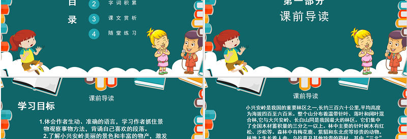 課前導讀學習目標 1.體會作者生動、準確的語言,學習作者抓住景物觀察事物方法,背誦自己喜歡的段落。2.了解小興安嶺美麗的景色和豐富的物產,激發同學們熱愛祖國大好河山的思想感情。