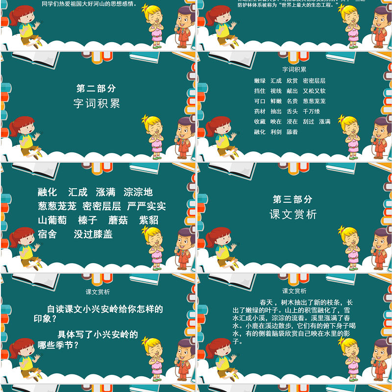 課文賞析 通過對這篇課文的學習,我們知道了小興安嶺一年四季景色優美,物產豐富。我們還掌握了學習的方法,并能應用這種方法自己學習,非常成功!