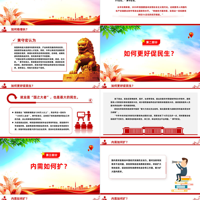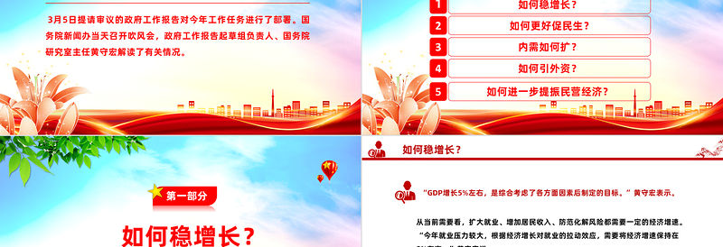 前 言 PREFACE 3月5日提請審議的政府工作報告對今年工作任務(wù)進(jìn)行了部署。國務(wù)院新聞辦當(dāng)天召開吹風(fēng)會,政府工作報告起草組負(fù)責(zé)人、國務(wù)院研究室主任黃守宏解讀了有關(guān)情況。