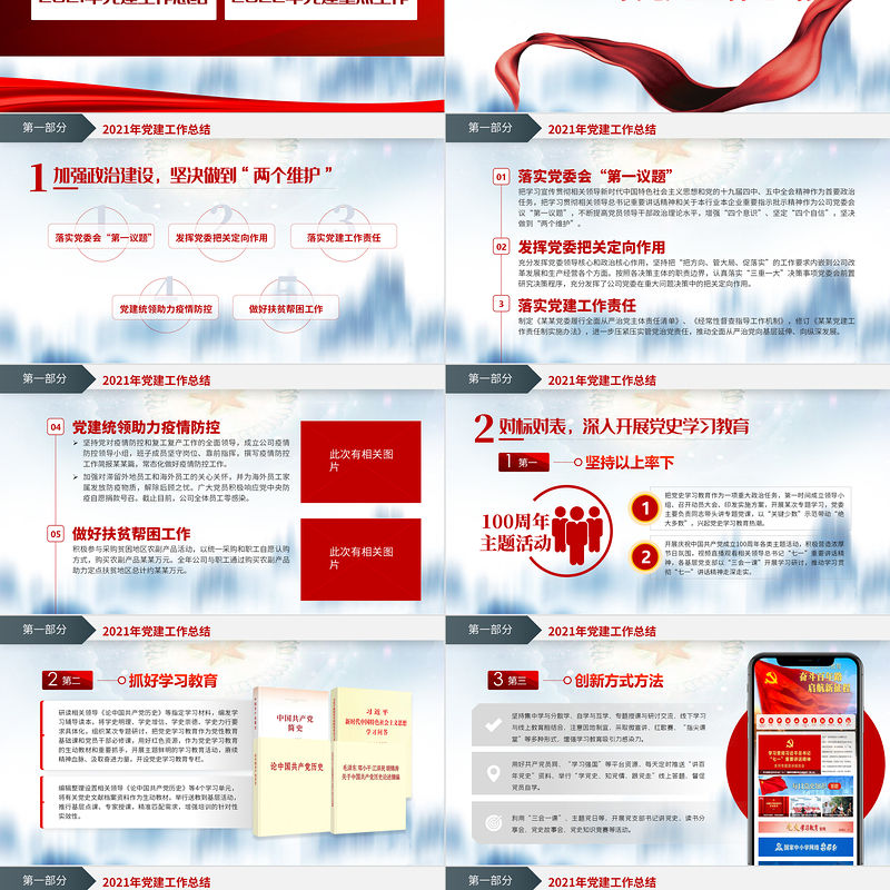 2021年黨建工作總結第一部分100周年主題活動把黨史學習教育作為一項重大政治任務,第一時間成立領導小組、召開動員大會、印發實施方案,開展某次專題學習,黨委主要負責同志帶頭講專題黨課,以“關鍵少數”示范帶動“絕大多數”,興起黨史學習教育熱潮。開展慶祝中國共產黨成立100周年各類主題活動,積極營造濃厚節日氛圍,視頻直播觀看相關領導總書記“七一”重要講話精神,各基層黨支部以“三會一課”開展學習研討,推動學習貫徹“七一”講話精神走深走實。