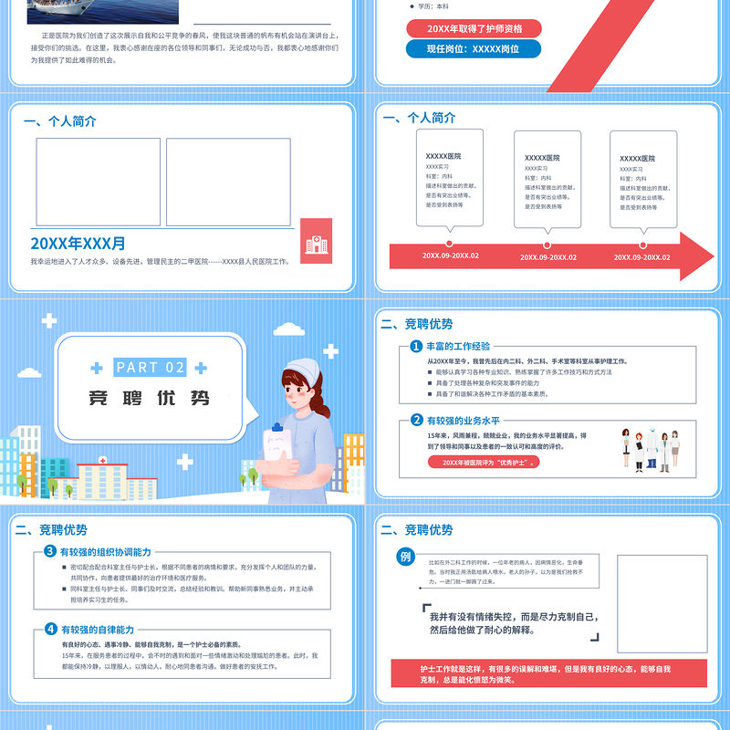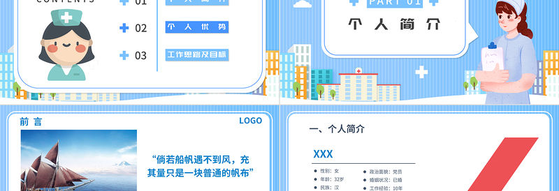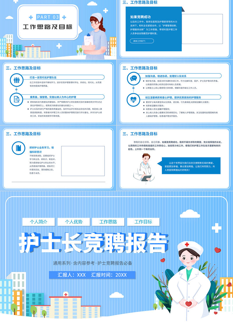 <p>匯報人:XXX 匯報時間:20XX通用系列·含內(nèi)容參考·護(hù)士競聘報告必備</p><br><p>0102CONTENTS目 錄個人簡介個人優(yōu)勢工作思路及目標(biāo)03</p><br><p>個人簡介PART 01</p><br><p>前 言“倘若船帆遇不到風(fēng),充其量只是一塊普通的帆布” 正是醫(yī)院為我們創(chuàng)造了這次展示自我和公平競爭的春風(fēng),使我這塊普通的帆布有機(jī)會站在演講臺上,接受你們的挑選。在這里,我衷心感謝在座的各位領(lǐng)導(dǎo)和同事們,無論成功與否,我都衷心地感謝你們?yōu)槲姨峁┝巳绱穗y得的機(jī)會。LOGO</p><br><p>一、個人簡介性別:女年齡:32歲民族:漢學(xué)歷:本科XXX政治面貌:黨員婚姻狀況:已婚工作經(jīng)驗(yàn):10年</p><br><p>一、個人簡介我幸運(yùn)地進(jìn)入了人才眾多、設(shè)備先進(jìn),管理民主的二甲醫(yī)院------XXXX縣人民醫(yī)院工作。20XX年XXX月</p><br><p>20XX.09-20XX.02XXXXX醫(yī)院XXXX實(shí)習(xí)科室:內(nèi)科描述科室做出的貢獻(xiàn),是否有突出業(yè)績等。是否受到表揚(yáng)等20XX.09-20XX.0220XX.09-20XX.02一、個人簡介XXXXX醫(yī)院XXXX實(shí)習(xí)科室:內(nèi)科描述科室做出的貢獻(xiàn),是否有突出業(yè)績等。是否受到表揚(yáng)等XXXXX醫(yī)院XXXX實(shí)習(xí)科室:內(nèi)科描述科室做出的貢獻(xiàn),是否有突出業(yè)績等。是否受到表揚(yáng)等</p><br><p>競聘優(yōu)勢PART 02</p><br><p>二、競聘優(yōu)勢</p><br><p>二、競聘優(yōu)勢</p><br><p>比如在外二科工作的時候,一位年老的病人,因病情惡化,生命垂危。當(dāng)時我正用湯匙給病人喂水,老人的孫子,以為是我們搶救不力,一進(jìn)門就一腳踢了過來。二、競聘優(yōu)勢</p><br><p>工作思路及目標(biāo)PART 03</p><br><p>三、工作思路及目標(biāo)如果競聘成功以后的工作中,我將在醫(yī)院及護(hù)理部領(lǐng)導(dǎo)的大力支持下,和科主任緊密合作,以“護(hù)理管理創(chuàng)新、護(hù)理服務(wù)創(chuàng)新”為工作思路,帶領(lǐng)科室護(hù)理工作人員爭創(chuàng)全院模范護(hù)理科室。</p><br><p>打造一支現(xiàn)代化護(hù)理隊(duì)伍把軟指標(biāo)變?yōu)閿?shù)據(jù)化的硬指標(biāo),并嚴(yán)格要求護(hù)士將實(shí)施情況及時準(zhǔn)確地用文字形式記錄在護(hù)理病歷上,使其成為數(shù)據(jù)化的量化依據(jù)之一。護(hù)士長及時進(jìn)行嚴(yán)格的服務(wù)質(zhì)量監(jiān)控,及時作出評價和找出存在的問題,制定病人滿意度調(diào)查制度,將患者對護(hù)理工作人員的整體護(hù)理情況進(jìn)行評分量化,并作為護(hù)士績效工資、獎金的發(fā)放提供可靠依據(jù)。在工作實(shí)踐中堅(jiān)持不懈地學(xué)習(xí),逐步實(shí)現(xiàn)護(hù)理管理科學(xué)化、系統(tǒng)化、現(xiàn)代化,從而更有效地提高護(hù)理質(zhì)量。重質(zhì)量,強(qiáng)管理,實(shí)施以病人為中心的護(hù)理三、工作思路及目標(biāo)</p><br><p>加強(qiáng)溝通,增進(jìn)協(xié)調(diào),處理好人際關(guān)系創(chuàng)立溫馨病房和愛心護(hù)理,提供優(yōu)質(zhì)高效的護(hù)理服務(wù)做好各方面、各層次的溝通和協(xié)調(diào)工作,盡力化解科室、醫(yī)護(hù)、護(hù)士及護(hù)患間的矛盾,以高度的同情心和責(zé)任感對待病人及家屬。以博愛之心和心理感悟力來體察、理解科室的每位工作人員。要求護(hù)士每天都堅(jiān)持從儀表美、語言美、行為美做起,給患者溫馨禮儀服務(wù);給患者溫馨知識服務(wù);給患者人性化溫馨護(hù)理服務(wù);關(guān)心病人的身心健康狀況和病情變化,了解病人護(hù)理措施,關(guān)注危重和自理困難的病人基礎(chǔ)護(hù)理等,給患者護(hù)理關(guān)懷服務(wù)。三、工作思路及目標(biāo)</p><br><p>抓好護(hù)士業(yè)務(wù)學(xué)習(xí),增強(qiáng)科研意識不斷探索進(jìn)取,定期組織護(hù)士學(xué)習(xí)新業(yè)務(wù)、新知識、新技術(shù),努力提高每位護(hù)士的業(yè)務(wù)水平,從而提高護(hù)理質(zhì)量,把各項(xiàng)工作落到實(shí)處,落到細(xì)微之處,防患于未然。 三、工作思路及目標(biāo)</p><br><p> 尊敬的各位領(lǐng)導(dǎo)、各位同事,如果我競聘成功,我將不辜負(fù)領(lǐng)導(dǎo)的期望,充分發(fā)揮我的長處,以昂揚(yáng)的工作熱情和高度的工作責(zé)任心,加倍努力地工作,使我們的護(hù)理工作在各方面都有新的起色,上升到一個新的臺階。三、工作思路及目標(biāo)</p><br><p>匯報人:XXX 匯報時間:20XX通用系列·含內(nèi)容參考·護(hù)士競聘報告必備</p><br>