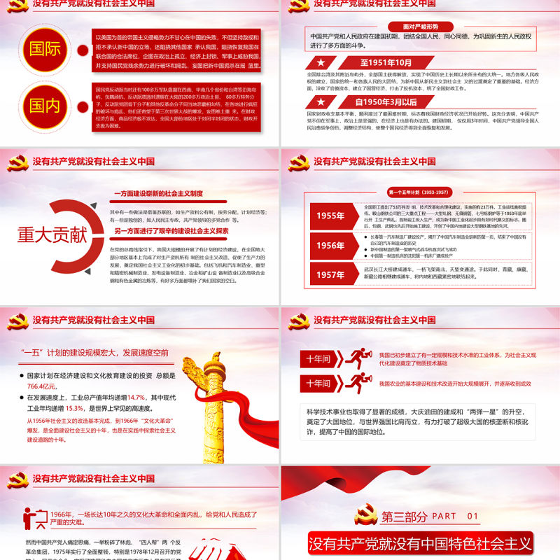 “一五”計劃的建設(shè)規(guī)模宏大,發(fā)展速度空前國家計劃在經(jīng)濟(jì)建設(shè)和文化教育建設(shè)的投資 總額是766.4億元,在發(fā)展速度上,工業(yè)總產(chǎn)值年均遞增14.7%,其中現(xiàn)代工業(yè)年均遞增 15.3%,是世界上罕見的高速度。從1956年社會主義的改造基本完成,到1966年“文化大革命”爆發(fā),是全面建設(shè)社會主義的十年,也是在實(shí)踐中探索社會主義建設(shè)道路的十年。