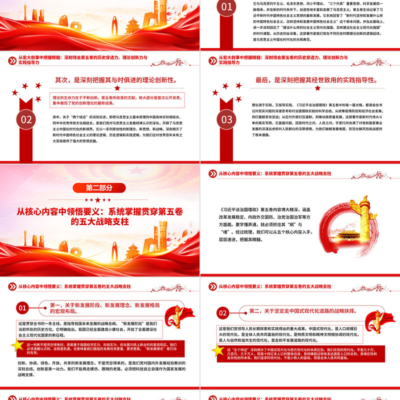 匯報人:某某某 日期:2025.11.26 今天我們齊聚一堂,舉行這次專題黨課,核心任務是共同深入學習領會《習近平談治國理政》第 五卷的核心要義。這部光輝的馬克思主義綱領性文獻,集中反映了黨的十九大以來,以習近平同 志為核心的黨中央在風云變幻的國際國內形勢下,團結帶領全黨全國各族人民奮進新征程、建功 新時代的偉大實踐與理論創造,是我們深刻理解和把握習近平新時代中國特色社會主義思想的 “金鑰匙”,是指引我們走好新的趕考之路的行動指南。 在2025年11月這個承前啟后的關鍵節點上,我們面臨著前所未有的機遇,也應對著嚴峻復雜的 挑戰。系統學習、深刻領會《習近平談治國理政》第五卷,對于我們統一思想、凝聚共識,在新 時代新征程上贏得主動、贏得優勢、贏得未來,具有極其重要的理論意義和現實意義。下面,我 將圍繞“如何準確把握《習近平談治國理政》第五卷的核心要義”這一主題,從歷史傳承、理論 創新與實踐探索三個維度,與同志們作一次深入的交流。 第一部分 從宏大敘事中把握精髓:深刻領會第五卷的歷史穿透力、理論創新力與 實踐指導力 01 首先,是深刻把握其一脈相承的歷史傳承性。 這部著作不是無源之水、無本之木,而是我們黨百余年奮斗史和理論探索史的 最新篇章。 它與馬克思列寧主義、毛澤東思想、鄧小平理論、“三個代表”重要思想、科學發展觀一 脈相承,并在新的時代條件下,創造性地豐富和發展了馬克思主義。第五卷生動記錄了習 近平新時代中國特色社會主義思想的最新發展,它系統回答了“新時代堅持和發展什么樣 的中國特色社會主義、怎樣堅持和發展中國特色社會主義”這個根本問題,并在此基礎上, 進一步深刻回應了“建設什么樣的社會主義現代化強國、怎樣建設社會主義現代化強國” 的時代課題。從歷史的縱深看,這部著作是我們黨在不同歷史時期理論創新的邏輯延續, 是馬克思主義中國化時代化的光輝典范。 從宏大敘事中把握精髓:深刻領會第五卷的歷史穿透力、理論創新力與 實踐指導力 02 其次,是深刻把握其與時俱進的理論創新性。 理論的生命力在于不斷創新。第五卷所收錄的文獻,絕大部分是首次公開發表, 集中展現了黨的創新理論的最新成果。 其中,關于“兩個結合”的深刻論述,即把馬克思主義基本原理同中國具體實際相結合、 同中華優秀傳統文化相結合,是我們黨對馬克思主義發展規律認識的深化,開辟了馬克思 主義中國化時代化的新境界。它以一系列原創性的新理念、新思想、新戰略,深刻揭示了 新時代中國特色社會主義的理論邏輯、歷史邏輯和實踐邏輯,為我們應對世界百年未有之 大變局提供了強大的思想武器。 從宏大敘事中把握精髓:深刻領會第五卷的歷史穿透力、理論創新力與 實踐指導力 03 最后,是深刻把握其經世致用的實踐指導性。 理論源于實踐,又指導實踐。《習近平談治國理政》第五卷中的每一篇文稿,都源自總書 記對現實問題的深邃思考和對治國理政實踐的科學總結。從統籌疫情防控和經濟社會發展, 到打贏脫貧攻堅戰;從應對外部打壓遏制,到推動高質量發展,這部著作是新時代偉大斗 爭的真實寫照。它直面問題、回答時代之問、人民之問,字里行間充滿了對黨和國家事業 發展的深謀遠慮和對人民群眾的深厚感情,為我們破解發展難題、防范化解風險挑戰提供 了根本遵循。 第二部分 從核心內容中領悟要義:系統掌握貫穿第五卷的五大戰略支柱 《習近平談治國理政》第五卷內容博大精深,涵蓋 改革發展穩定、內政外交國防、治黨治國治軍等方 方面面。要學懂弄通,就必須抓住其“綱”與 “魂”。經過梳理,我們可以從五個核心內容入手, 層層遞進,把握其精髓。 從核心內容中領悟要義:系統掌握貫穿第五卷的五大戰略支柱 01 第一,關于新發展階段、新發展理念、新發展格局 的宏觀布局。 這是貫穿全書的一條主線,是指導我國未來發展的戰略總綱。“新發展階段”是我們 當前所處的歷史方位。它明確指出,我國已經全面建成小康社會,開啟了全面建設社 會主義現代化國家的新征程。 這一判斷不是憑空得來的,而是基于我國經濟實力、科技實力、綜合國力躍上新臺階的客觀現實。我們 必須清醒認識到,這既是機遇,也意味著我們面臨的發展任務更重、要求更高。“新發展理念”是行動 的先導。 創新、協調、綠色、開放、共享的新發展理念,不是憑空得來的,是我們黨對國內外發展經驗教訓的 深刻總結。創新是第一動力。我們不能再走模仿、跟隨的老路,必須把科技自立自強作為國家發展的 戰略支撐。 從核心內容中領悟要義:系統掌握貫穿第五卷的五大戰略支柱 02 第二,關于堅定走中國式現代化道路的戰略抉擇。 這是我們黨領導人民長期探索和實踐得出的重大成果。中國式現代化,是人口規模巨 大的現代化,是全體人民共同富裕的現代化,是物質文明和精神文明相協調的現代化, 是人與自然和諧共生的現代化,是走和平發展道路的現代化。 這“五個特征”深刻揭示了中國式現代化與西方現代化的本質區別。我們實現的現代化,不是幾十萬、 幾百萬、幾千萬人,而是十四億多人口的整體邁進,其規模超過現有發達國家人口的總和,其艱巨性和 復雜性前所未有。我們追求的現代化,不是少數人的富裕,而是全體人民共同富裕。 從核