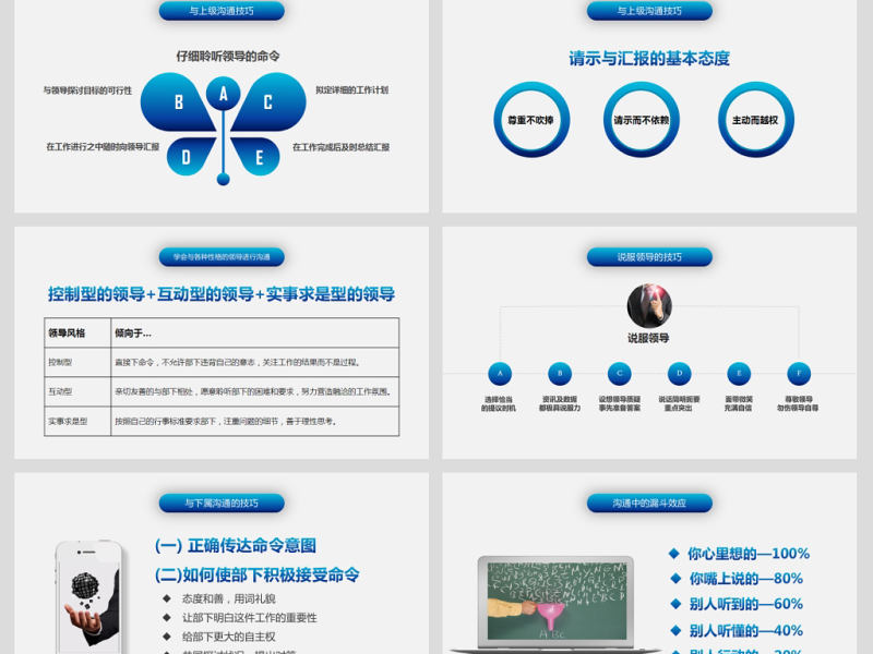 與上級溝通技巧在工作完成后及時總結匯報在工作進行之中隨時向領導匯報 擬定詳細的工作計劃 與領導探討目標的可行性 仔細聆聽領導的命令