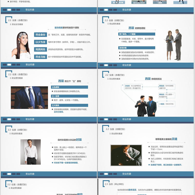 2.2 儀表(衣著打扮)3. 職業(yè)男性著裝西裝 的三個(gè)“三”原則三色原則即全身穿著限制在三種顏色之內(nèi)。三一定律鞋子、皮帶、公文包 一個(gè)顏色。三大禁忌忌衣袖商標(biāo)未摘掉、忌西裝與皮鞋不相配、忌不打領(lǐng)帶。