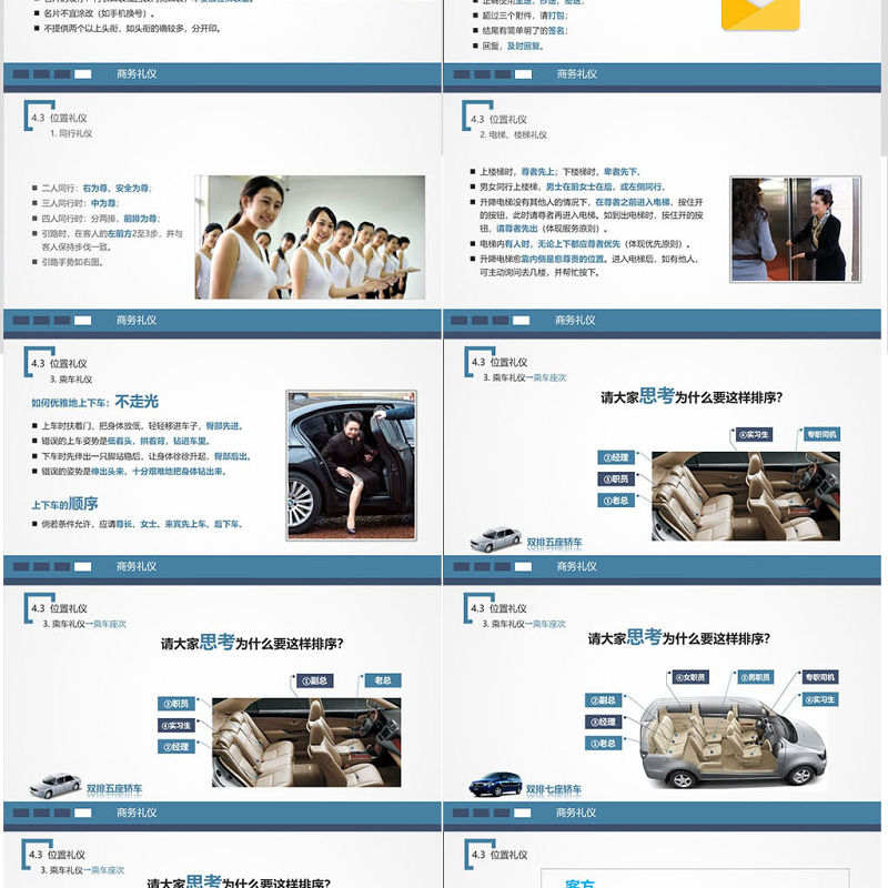4.3 位置禮儀3. 乘車(chē)禮儀上車(chē)時(shí)扶著門(mén),把身體放低,輕輕移進(jìn)車(chē)子,臀部先進(jìn)。錯(cuò)誤的上車(chē)姿勢(shì)是低著頭,拱著背,鉆進(jìn)車(chē)?yán)铩O萝?chē)時(shí)先伸出一只腳站穩(wěn)后,讓身體徐徐升起,臀部后出。錯(cuò)誤的姿勢(shì)是伸出頭來(lái),十分艱難地把身體鉆出來(lái)。如何優(yōu)雅地上下車(chē):不走光上下車(chē)的順序倘若條件允許,應(yīng)請(qǐng)尊長(zhǎng)、女士、來(lái)賓先上車(chē)、后下車(chē)。