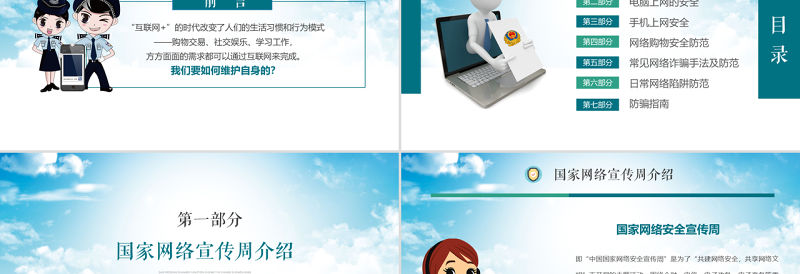 目 錄國家網絡宣傳周介紹電腦上網的安全手機上網安全網絡購物安全防范常見網絡詐騙手法及防范日常網絡陷阱防范防騙指南第一部分第二部分第三部分第四部分第五部分第六部分第七部分