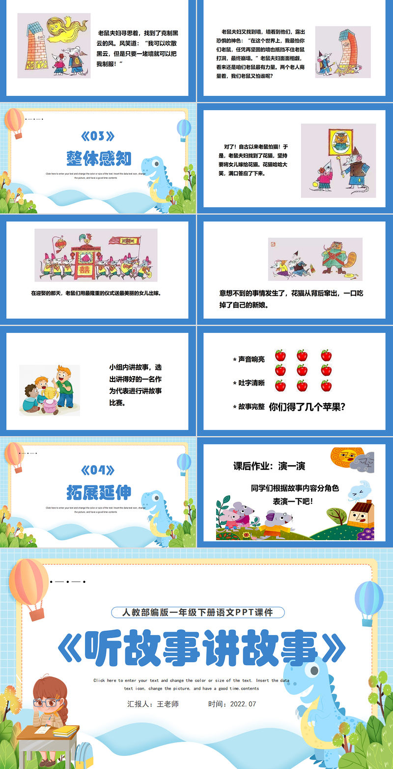 Click here to enter your text and change the color or size of the text. Insert the data text icon, change the picture, and have a good time.contents人教部編版一年級下冊語文PPT課件《聽故事講故事》匯報人:王老師 時間:2022.07