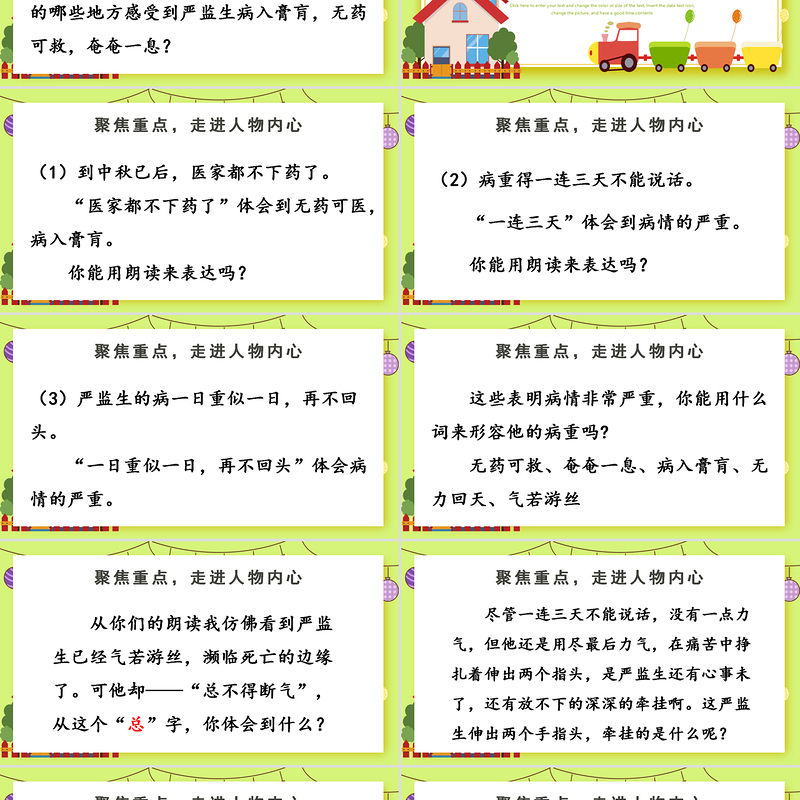 這些表明病情非常嚴重,你能用什么詞來形容他的病重嗎? 無藥可救、奄奄一息、病入膏肓、無力回天、氣若游絲聚焦重點,走進人物內心
