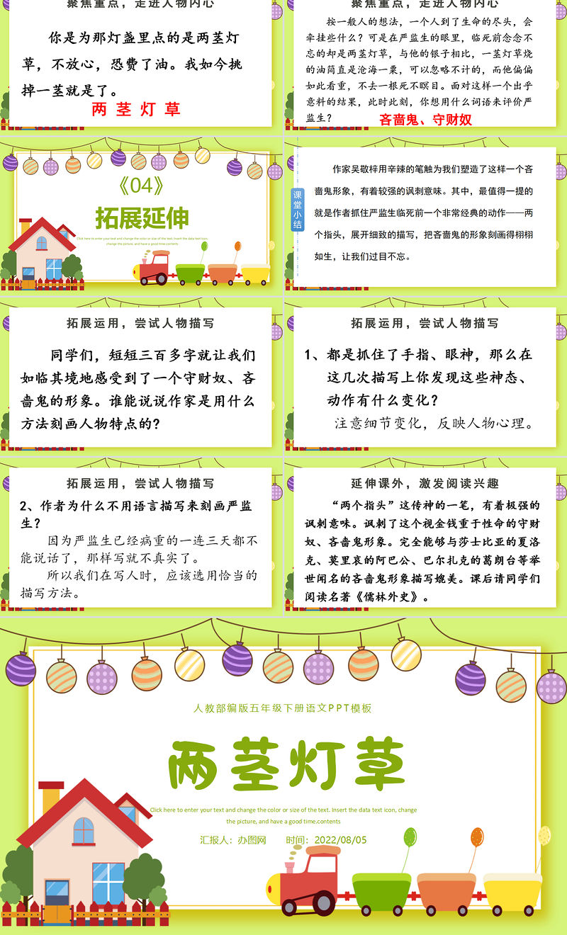 Click here to enter your text and change the color or size of the text. Insert the data text icon, change the picture, and have a good time.contents人教部編版五年級下冊語文PPT模板兩莖燈草匯報人:辦圖網 時間:2022/08/05