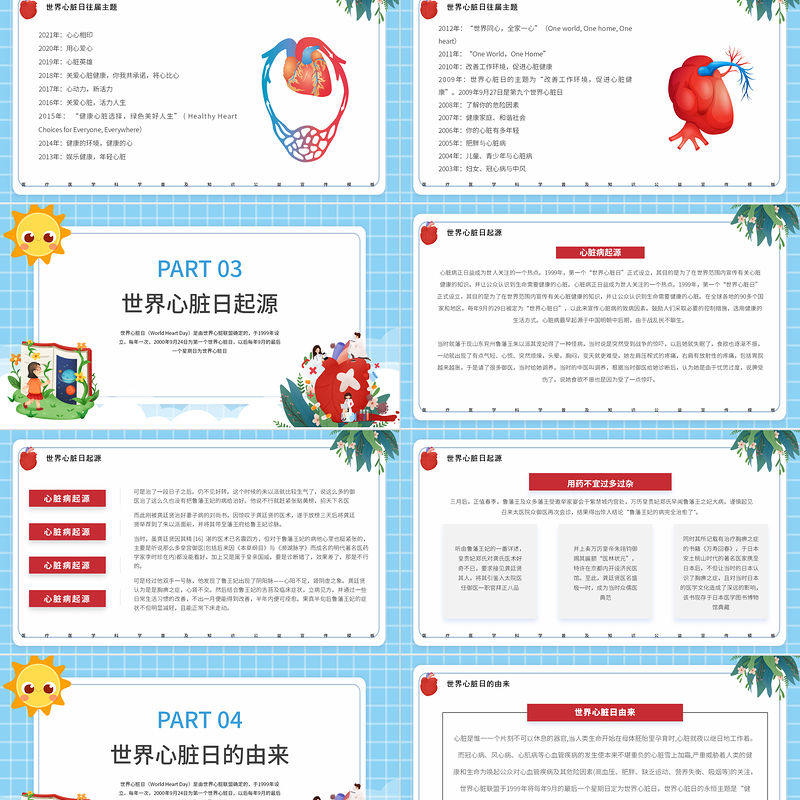 醫(yī)療醫(yī)學(xué)科學(xué)普及知識公益宣傳模板2012年:“世界同心,全家一心”(One world, One home, One heart) 2011年:“One World,One Home” 2010年:改善工作環(huán)境,促進心臟健康2009年:世界心臟日的主題為“改善工作環(huán)境,促進心臟健康”。2009年9月27日是第九個世界心臟日2008年:了解你的危險因素2007年:健康家庭、和諧社會2006年:你的心臟有多年輕2005年:肥胖與心臟病2004年:兒童、青少年與心臟病2003年:婦女、冠心病與中風(fēng)
