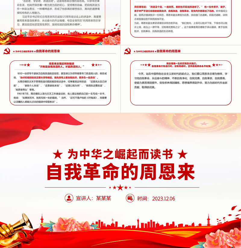 工圖網(wǎng)提供自我革命的周恩來PPT紅色精美早期共產(chǎn)黨人的自我革命精神黨史天天學(xué)黨課課件供會員免費(fèi)下載。更多精彩黨課PPT素材,盡在工圖網(wǎng)。